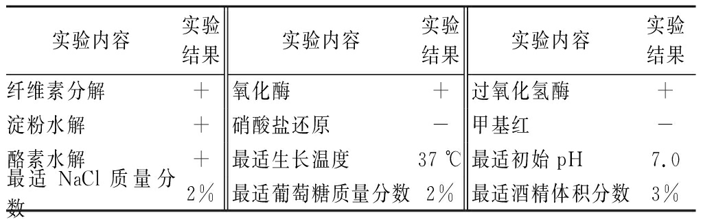 实验内容实验结果实验内容实验结果实验内容实验结果纤维素分解+氧化酶+过氧化氢酶+淀粉水解+硝酸盐还原-甲基红-酪素水解+最适生长温度37 ℃最适初始pH7.0最适NaCl质量分数2%最适葡萄糖质量分数2%最适酒精体积分数3%
