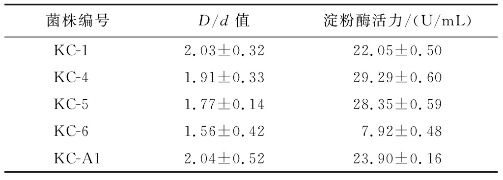 菌株编号D/d值淀粉酶活力/(U/mL)KC-12.03±0.3222.05±0.50KC-41.91±0.3329.29±0.60KC-51.77±0.1428.35±0.59KC-61.56±0.427.92±0.48KC-A12.04±0.5223.90±0.16