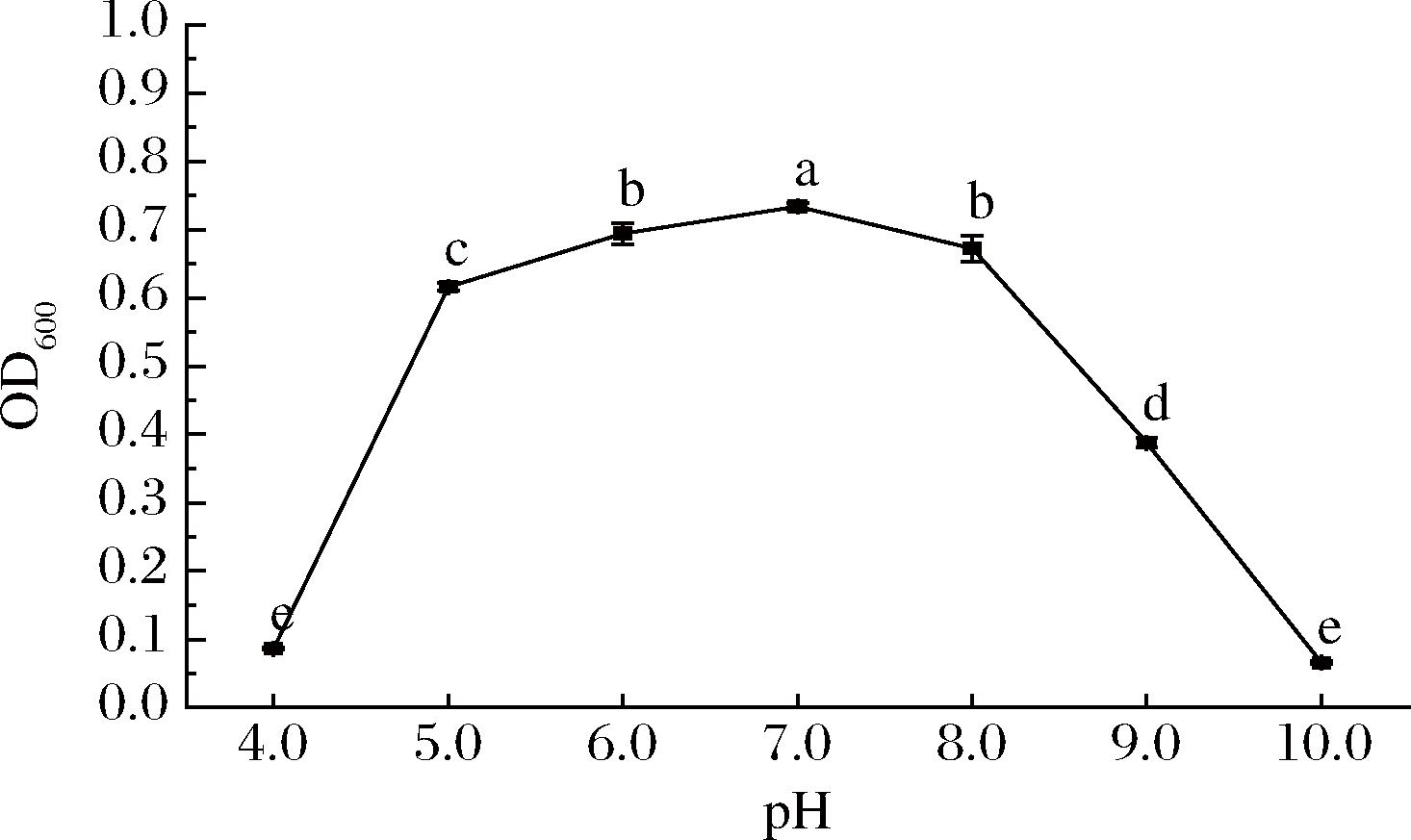 pH值能影响微生物细胞内的电解质平衡,进而影响其生长代谢[23]。由图5可知,该菌在pH 5.0~9.0内,菌株表现出良好的生长状态,且在pH值为7.0条件下的生长情况明显优于其他pH条件,然而pH值为4.0、10.0条件下,菌株几乎不能生长。因此,该菌株在弱酸性条件下仍能保持一定的活性,与酒曲发酵初期酸性环境相适应[24];而在弱碱性条件下,尽管生长速度有所减缓,但芽孢形成能力增强,这有助于其在发酵后期或贮存期的存活,进一步凸显了该菌株在传统发酵体系中的生态适应性优势[25]。