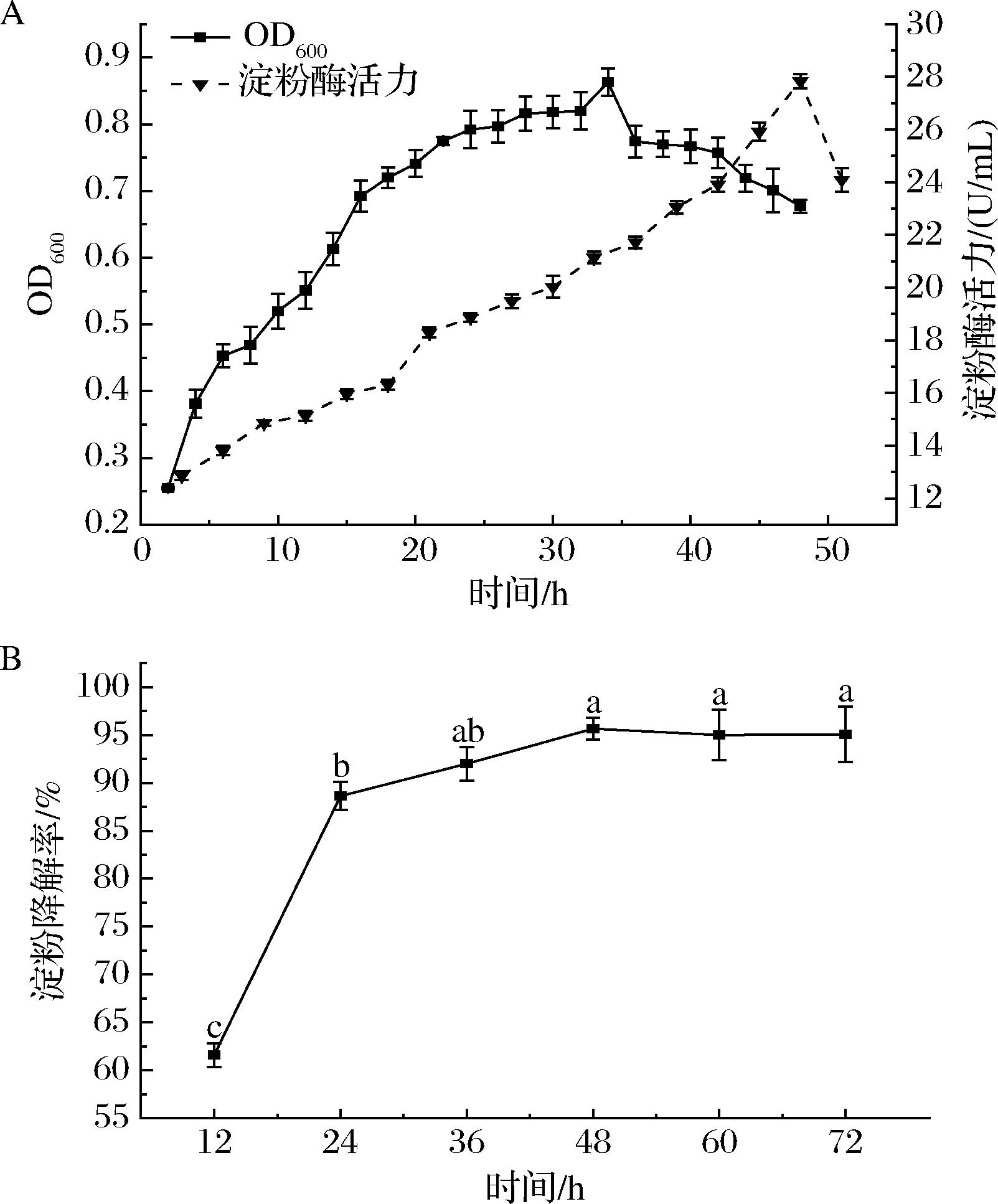 A-生长曲线、酶活力曲线;B-淀粉降解率曲线