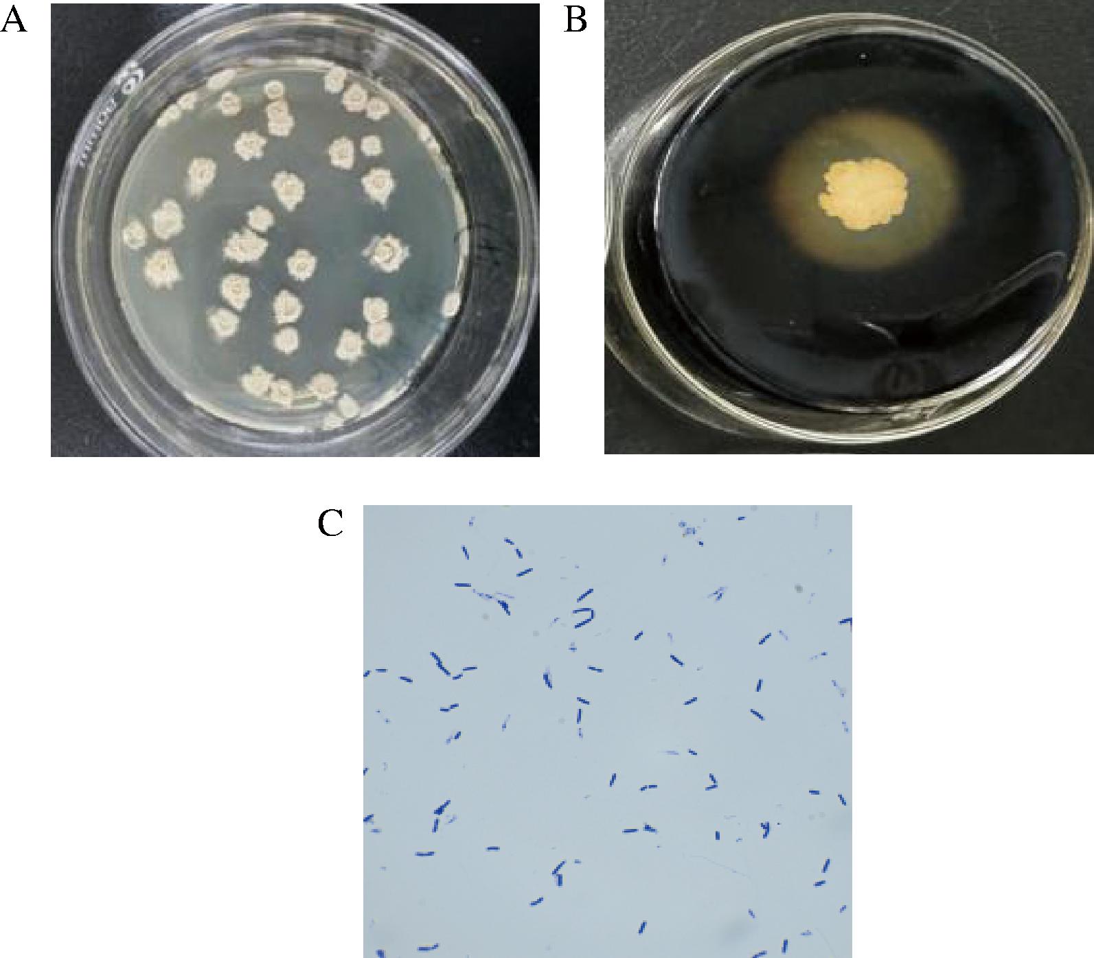 A-菌落形态;B-菌株透明圈;C-革兰氏染色后镜检
