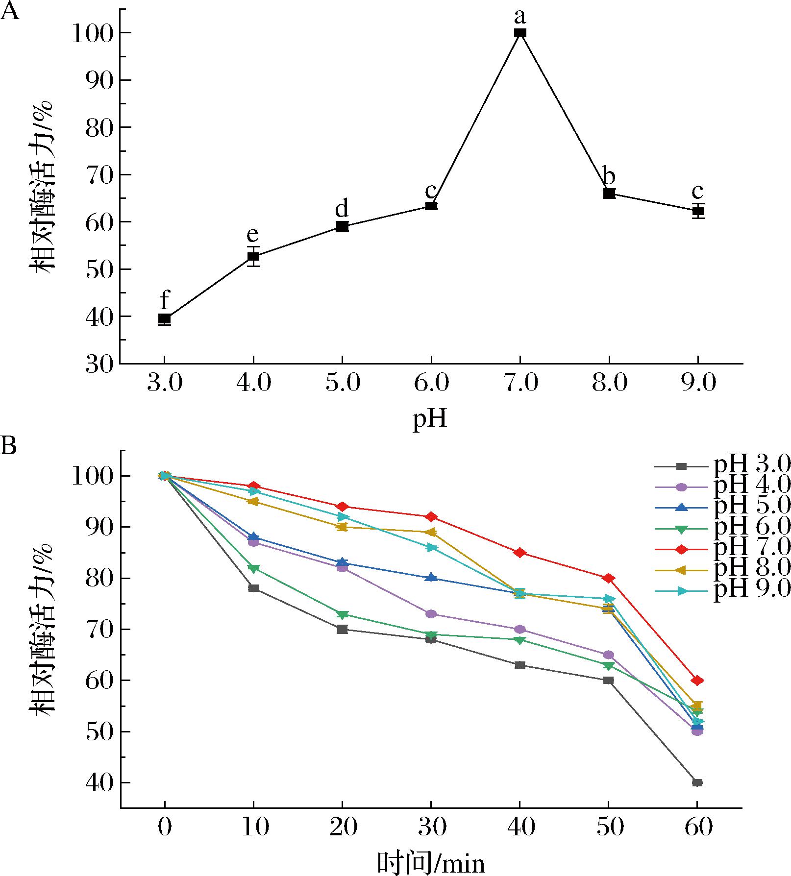 由图10-A可知,该菌所产淀粉酶的最适反应pH值为7.0,在 pH 3.0~9.0时呈现先上升后下降的趋势,但都保持40%以上的相对酶活力。在pH 5.0~9.0时,酶活力均能达到最大值的55%以上,说明该淀粉酶在较宽的pH范围内具有较高的活力,其中在pH 5.0~6.0是青稞酒发酵初期的酸性环境,表明其适应性强,与发酵工艺中自然pH波动高度匹配甚至更为广泛[29],具有较好的应用前景;且淀粉酶的最适pH值与菌株最适生长pH值一致(均为7.0),说明其代谢系统与酶功能协同进化,适应发酵过程中pH的自然波动。
