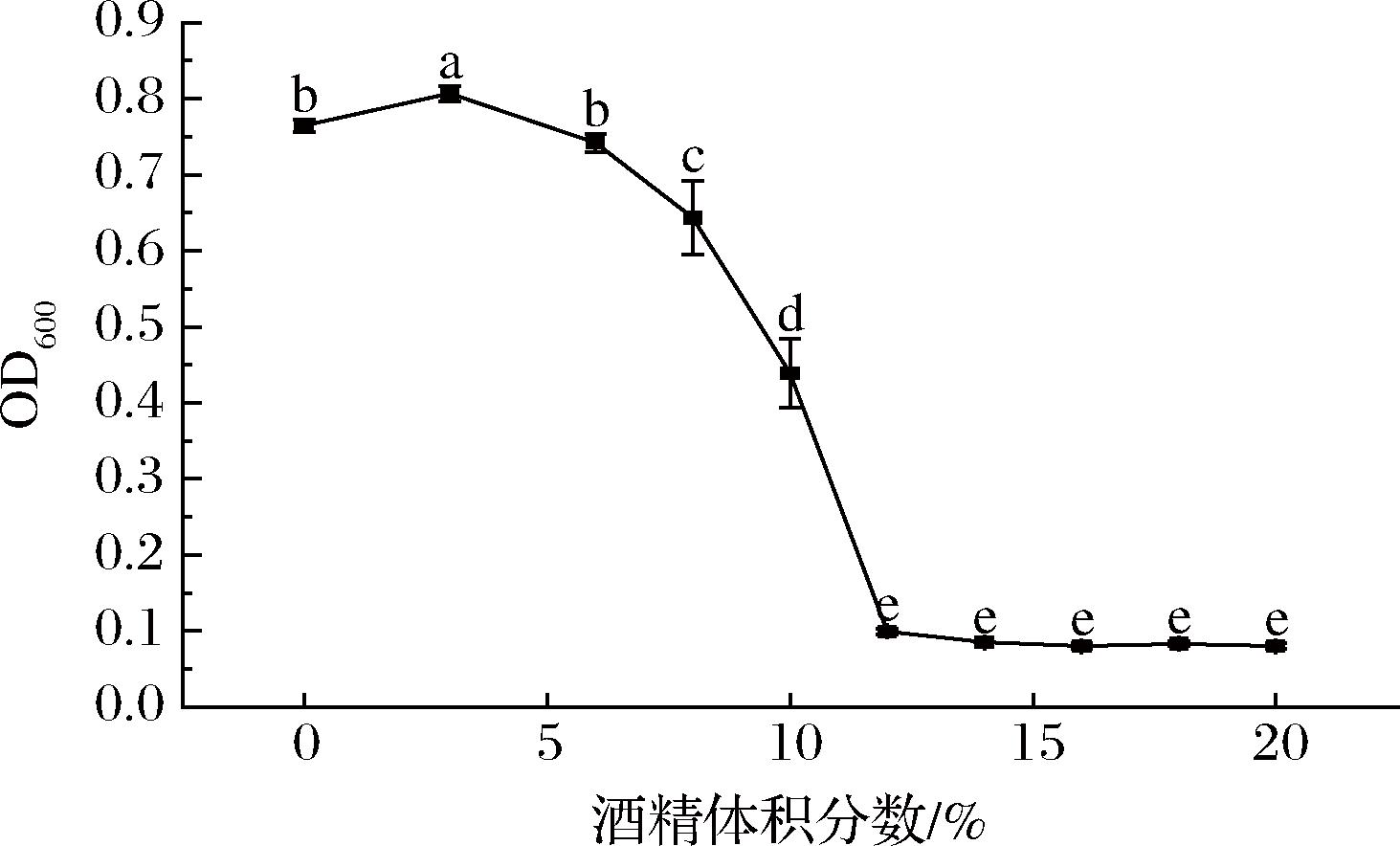 酒精是大曲中酵母菌厌氧发酵的产物。高浓度酒精环境引发微生物代谢胁迫,酒精对细胞的抑制作用较为复杂,主要体现在抑制微生物的增殖速度、存活能力以及发酵效率3个方面[27]。由图8可知,菌株KC-4的生长在酒精体积分数3%时菌体浓度最大,之后酒精含量增加,其菌体浓度逐渐下降。但菌株KC-4在酒精体积分数在10%以内均能维持基础代谢(OD600>0.4);当浓度阈值突破12%时则完全生长抑制(OD600≈0.1)。