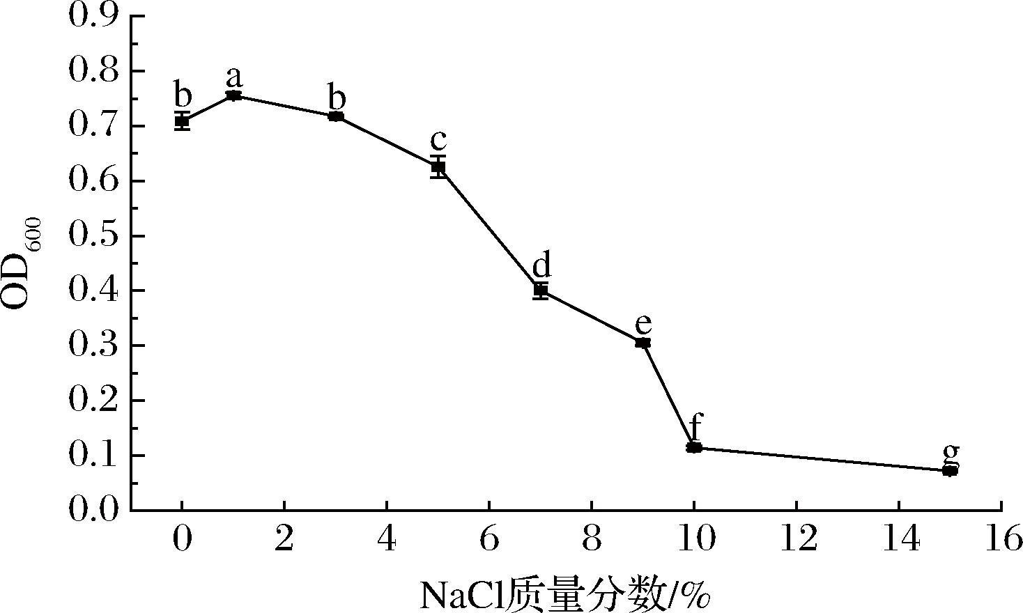 图6 NaCl质量分数对菌株KC-4生长的影响