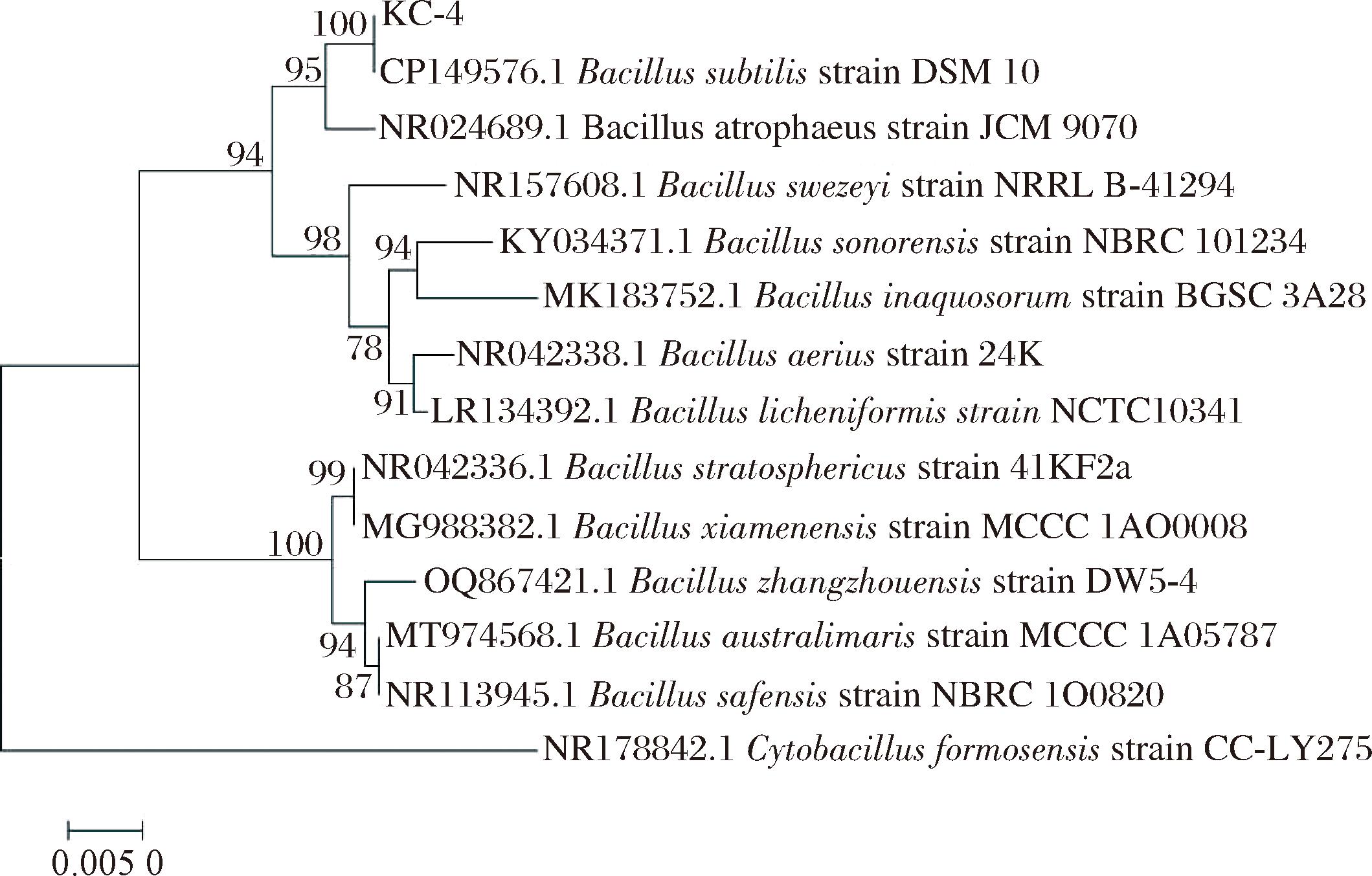 图2 基于16S rDNA基因序列构建菌株KC-4的系统发育进化树
