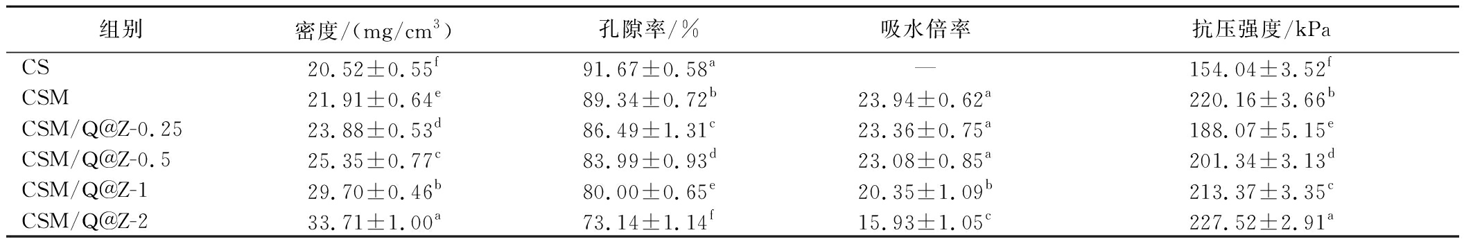 组别密度/(mg/cm3)孔隙率/%吸水倍率抗压强度/kPaCS20.52±0.55f91.67±0.58a—154.04±3.52fCSM21.91±0.64e89.34±0.72b23.94±0.62a220.16±3.66bCSM/Q@Z-0.2523.88±0.53d86.49±1.31c23.36±0.75a188.07±5.15eCSM/Q@Z-0.525.35±0.77c83.99±0.93d23.08±0.85a201.34±3.13dCSM/Q@Z-129.70±0.46b80.00±0.65e20.35±1.09b213.37±3.35cCSM/Q@Z-233.71±1.00a73.14±1.14f15.93±1.05c227.52±2.91a