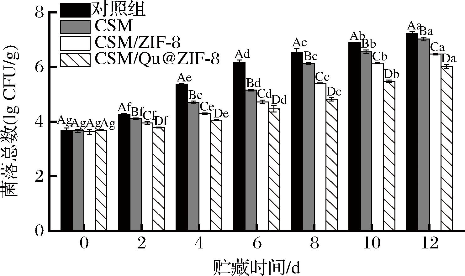 猪肉中的菌落总数是评价猪肉质量的重要指标,根据GB/T 9959.2—2008《分割鲜、冻猪瘦肉》,猪肉的菌落总数大于6 lg CFU/g时为变质肉。如图9所示,对照组在第6天时菌落总数已达6.17 lg CFU/g,CSM的菌落总数在第8天时为6.13 lg CFU/g,CSM/ZIF-8菌落总数在第10天时为6.14 lg CFU/g。而CSM/Qu@ZIF-8组在第12天时仅为6.01 lg CFU/g,略超过变质标准,这是由于Qu@ZIF-8受微酸性猪肉汁液触发,释放出Zn2+和槲皮素抑制微生物的生长。MALVANO等[27]开发了能延长鸡胸肉片保鲜期的槲皮素-海藻酸盐涂层,槲皮素通过增加细菌细胞膜通透性,并利用其酚类成分抑制钙、钾离子的跨膜运输,抑制肉类腐败菌的生长,使涂层处理组的菌落总数达到安全限值的时间较对照组延迟3 d。