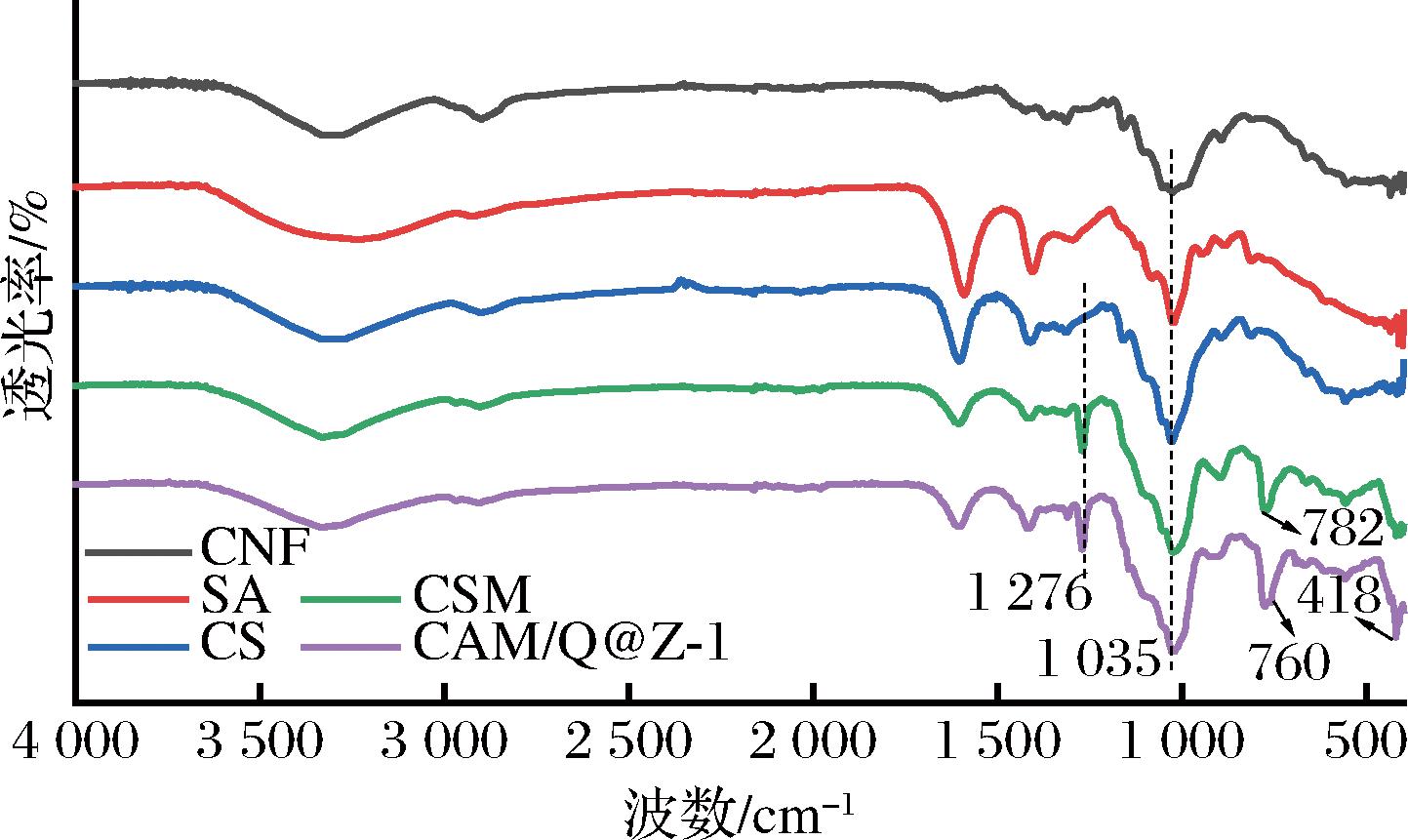 如图4所示,添加了MTMS后,1 276 cm-1和782 cm-1处的吸收峰对应Si—C和Si—O—Si,表明硅氧烷网络的形成[20]。1 035 cm-1处的峰有所增强,对应Si—O—C键的不对称拉伸,表明共价键的形成[21]。此外,在CSM/Q@Z-1在760 cm-1和418 cm-1处出现了属于Qu@ZIF-8的特征峰,表明其在气凝胶中保持完整。