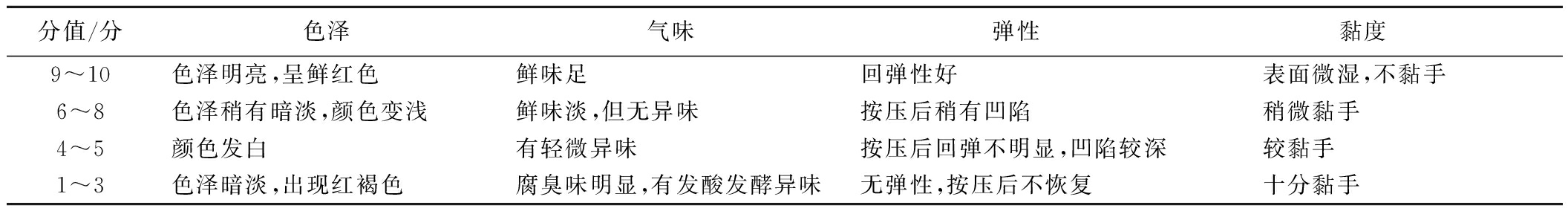 分值/分色泽气味弹性黏度 9~10色泽明亮,呈鲜红色鲜味足回弹性好表面微湿,不黏手6~8色泽稍有暗淡,颜色变浅鲜味淡,但无异味按压后稍有凹陷稍微黏手4~5颜色发白有轻微异味按压后回弹不明显,凹陷较深较黏手1~3色泽暗淡,出现红褐色腐臭味明显,有发酸发酵异味无弹性,按压后不恢复十分黏手