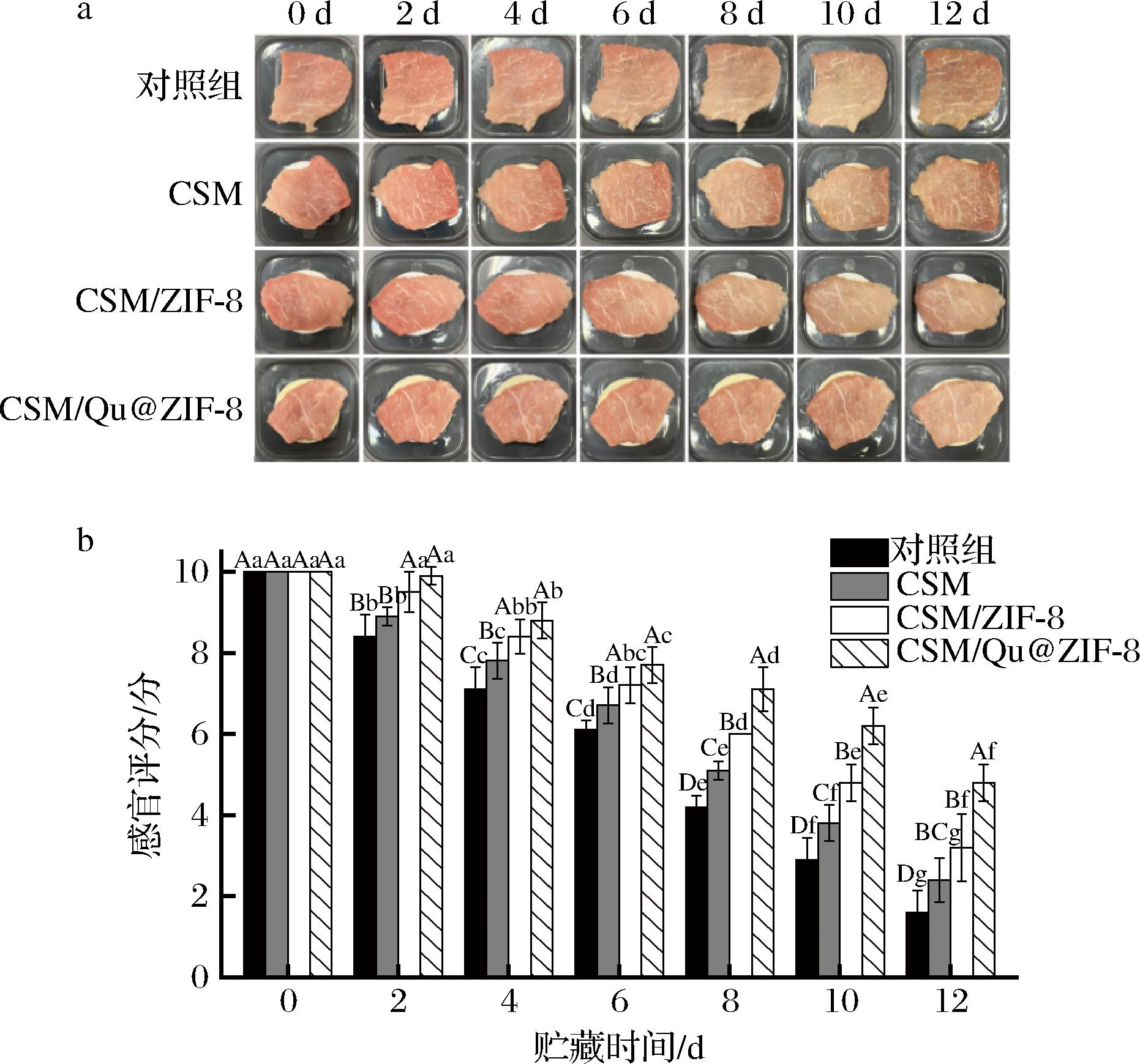 对贮藏期间的猪肉进行感官评价,其外观变化和感官评分分别如图12-a和图12-b所示。随着时间延长,猪肉由初始的鲜红色逐渐变暗淡和发白,最后出现明显的红褐色变质区域,这与L*与a*的测试结果一致。CSM/Qu@ZIF-8组猪肉的色泽、气味、弹性和黏度评价均高于其他组,对照组在第6天时按压后的恢复程度和速度降低并轻微黏手,在第12天时各组区别明显,对照组表面发干变硬情况严重,肌肉结构松散失去弹性,十分黏腻并伴随较大异味,而CSM/Qu@ZIF-8组出现了轻微的异味和黏手现象。微生物分解蛋白质和脂肪会导致肌肉结构松散,同时代谢产生多糖物质使表面发黏,此外,脂质氧化增加细胞膜通透性,导致胞质溶胶渗出会加重结构和触感的恶化[31]。