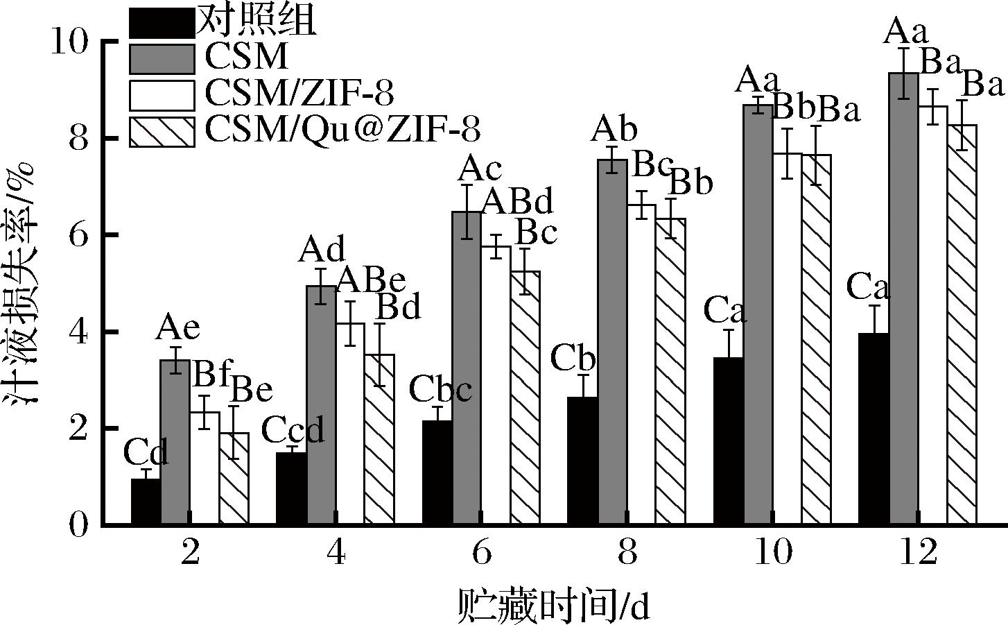 在鲜肉贮藏期间,微生物繁殖造成组织细胞破坏,进而导致脂肪和蛋白质的氧化分解及水分流失。如图7所示,各组的汁液损失率都呈上升趋势。冷藏12 d后,CSM、CSM/ZIF-8、CSM/Qu@ZIF-8组的汁液损失率分别为9.35%、8.65%、8.27%,这是由于ZIF-8和Qu@ZIF-8赋予气凝胶抗菌和抗氧化能力,抑制微生物的生长和鲜肉氧化。此外,由于气凝胶的高吸水性,汁液损失率均显著高于对照组的3.94%(P<0.05)。JIANG等[25]使用吸水垫也出现了类似结果,并发现使用吸水衬垫后能将鲜肉的保鲜期延长至少3 d。这是因为鲜肉渗出的汁液为微生物生长提供有利条件,通过衬垫及时吸收托盘中的水分,有助于延缓鲜肉的变质。