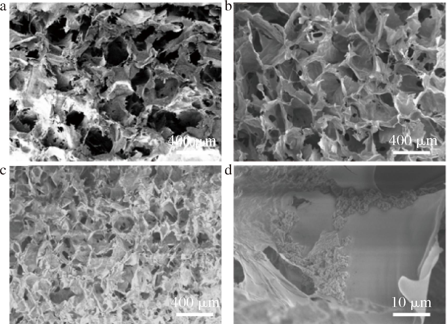 图3-a和图3-b为气凝胶截面的扫描电镜图像。CNF和SA之间以氢键和物理缠绕的弱相互作用力为主,呈现出松散的片状结构和不规则的孔道。当引入MTMS作为交联剂后,形成共价键增强分子间作用力,使气凝胶的孔道结构趋于规则化,呈现出有序的多孔网络,有利于提高材料的力学性能,这与气凝胶呈现的抗压强度结果相一致。由图3-c和图3-d可以观察到,Qu@ZIF-8均匀地吸附在气凝胶的孔壁上,在微观尺度上轻微影响孔道成型的均匀性,但未显著破坏气凝胶的共价交联框架。