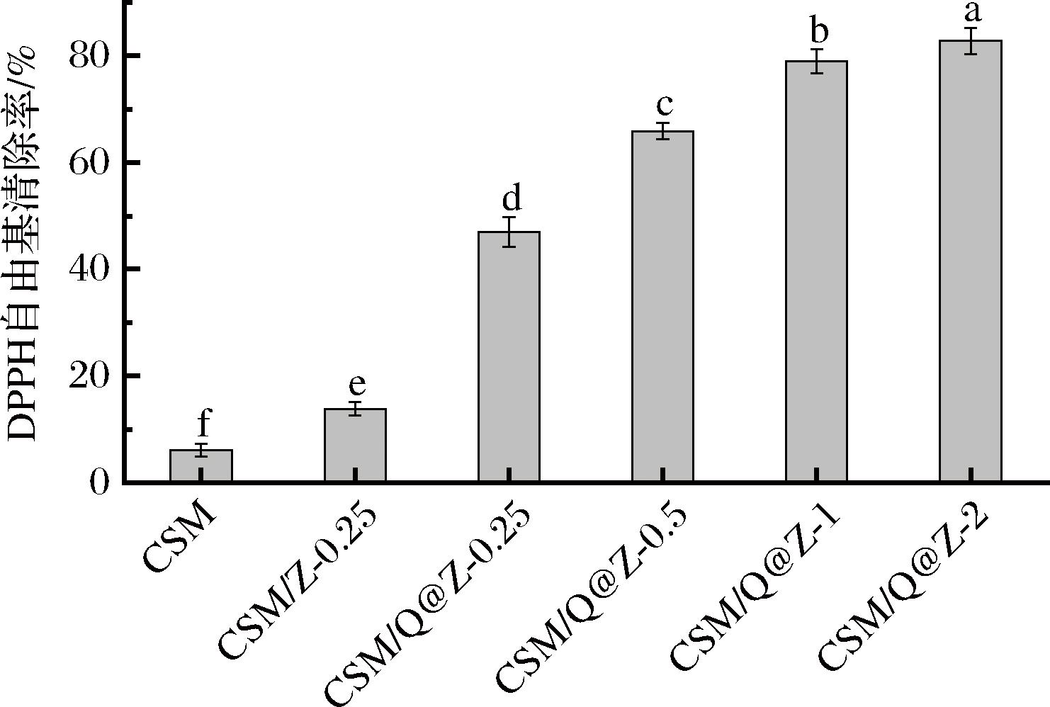 DPPH自由基清除率可用来评估材料的抗氧化能力,清除率越高代表抗氧化能力越强,气凝胶的DPPH自由基清除率如图6所示。CSM、CSM/Z-0.25、CSM/Q@Z-0.25、CSM/Q@Z-0.5、CSM/Q@Z-1、CSM/Q@Z-2的DPPH自由基清除率分别是6.23%、13.83%、46.97%、65.89%、78.92%、82.79%。气凝胶的抗氧化活性随Qu@ZIF-8的加入显著增强(P<0.05)。CSM/Q@Z-0.25的DPPH自由基清除率较CSM/Z-0.25提高了30%以上,这是由于槲皮素的酚羟基具有优异的DPPH自由基清除能力[23]。在ZHANG等[24]的研究中,游离槲皮素的DPPH自由基清除率可达92.0%,使用载体包覆槲皮素后DPPH自由基清除率略有下降,但能有效地保护槲皮素的生物活性。