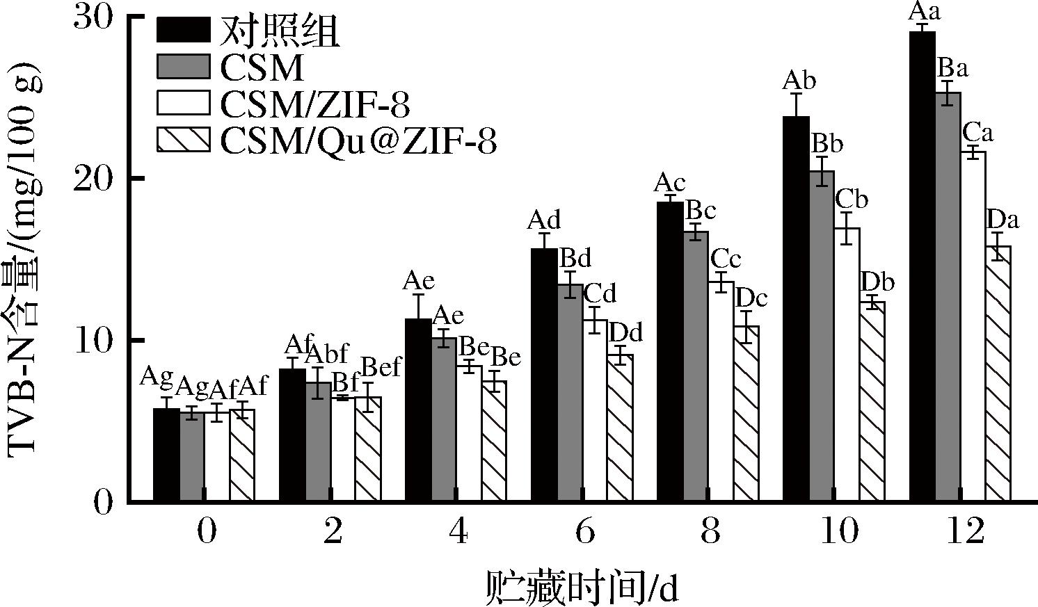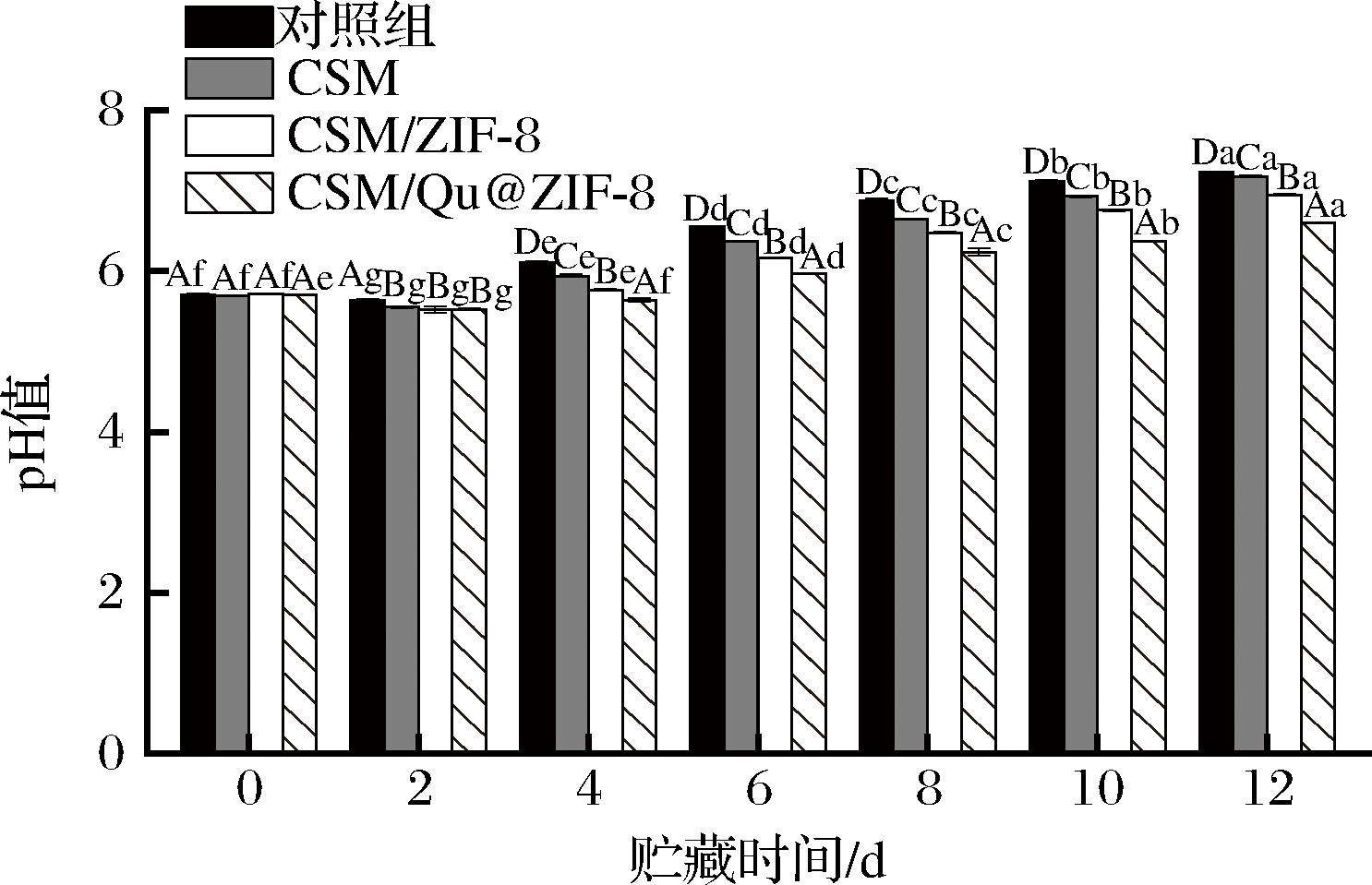 在微生物和酶的作用下,肉类的蛋白质会分解并产生氨、胺等碱性物质,因此,猪肉的pH会随着贮藏时间延长而逐渐升高。如图8所示,各组鲜肉的pH均呈现先降后升的趋势,初期pH降低可能与猪肉酶解产生的乳酸和肌肉三磷酸腺苷降解产生的磷酸有关[26]。猪肉的pH值超过6.7即为变质肉[5]。对照组的猪肉在第8天时pH值已达6.88,CSM和CSM/ZIF-8组在第10天时的pH值分别是6.92和6.75,而CSM/Qu@ZIF-8组在第12天时的pH值仅为6.6,表明使用CSM/Qu@ZIF-8气凝胶能有效减缓pH的上升,延长猪肉的保鲜期。