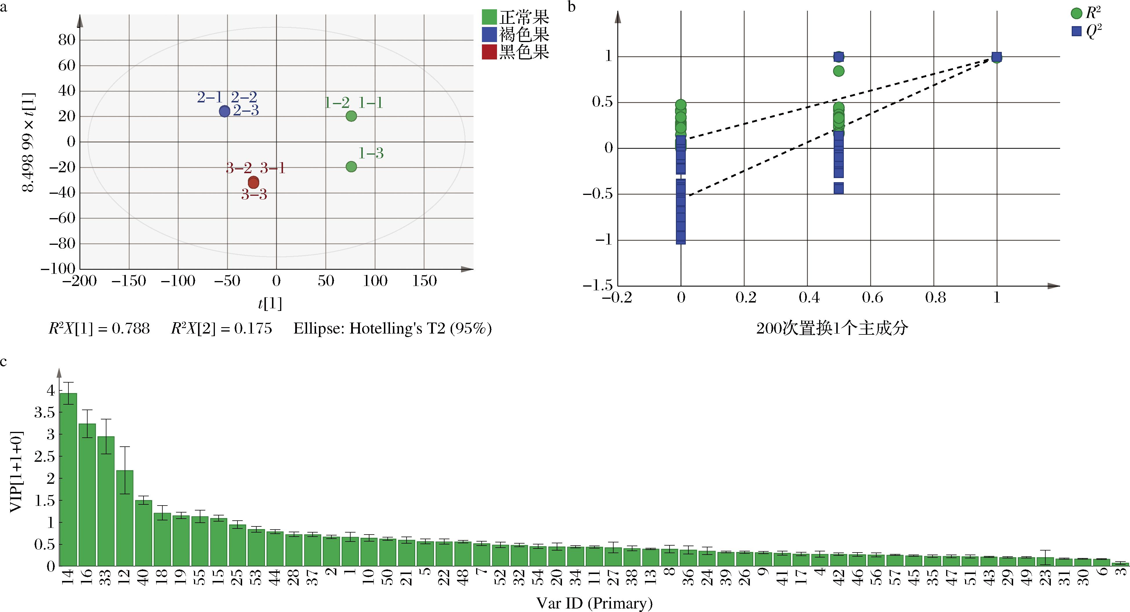 为进一步研究不同形态威代尔葡萄的香气差异,以57个共有香气组分作为自变量,不同形态作为因变量,通过正交偏最小二乘判别分析(orthogonal partial least-squares discrimination analysis,OPLS-DA),可以实现3种形态的有效区分。本次分析中的自变量拟合指数(R2x)为0.963,因变量拟合指数(R2y)为0.912,模型预测指数(Q2)为0.996,R2和Q2超过0.5,表示模型拟合结果可接受。由得分图(图5-a)可知,不同形态的样品分别处于椭圆的不同区域,每组样品内的重复样品较为密集,表明皱缩程度不同对葡萄风味组分具有明显的差异,并且样品组内的重复性好。经过200次置换检验,如图5-b所示,Q2回归线在纵坐标的截距小于0,Q2最右侧的点高于左侧的点说明模型不存在过拟合,模型验证有效,认为该结果可用于不同形态香气鉴别分析。OPLS-DA模型中的变量投影重要性(variable importance plot,VIP)值可以反映各挥发性化合物的差异贡献度,VIP值越大表明差异贡献程度越大[29],当VIP值>1时可认为是重要差异化合物。如图5-c所示,在OPLS-DA模型中共检测出9种VIP值>1的物质,分别是:正己醇(14)、6-甲基-3-庚醇(16)、己醛(33)、3-甲基-3-丁烯-1-醇(12)、2-己烯醛(40)、1-辛烯-3-醇(18)、(R)-(+)-β-香茅醇(55)、庚醇(19)和(E)-3-己烯-1-醇(15),其中1-辛烯-3-醇、3-甲基-3-丁烯-1-醇在黑色果中的含量显著高于正常果和褐色果,6-甲基-3-庚醇和(R)-(+)-β-香茅醇在褐色果中的含量显著高于正常果和黑色果,正己醇、(E)-3-己烯-1-醇、庚醇、己醛和2-己烯醛在正常果中的含量显著高于褐色果和黑色果。由此可知,不同形态果实的高含量差异物是以醇类、萜烯类和醛酮类化合物为主,说明这三类化合物对不同形态果实的香气特征影响较大。这与上述的香气种类及含量分析结果一致,进一步验证了模型的可靠性。