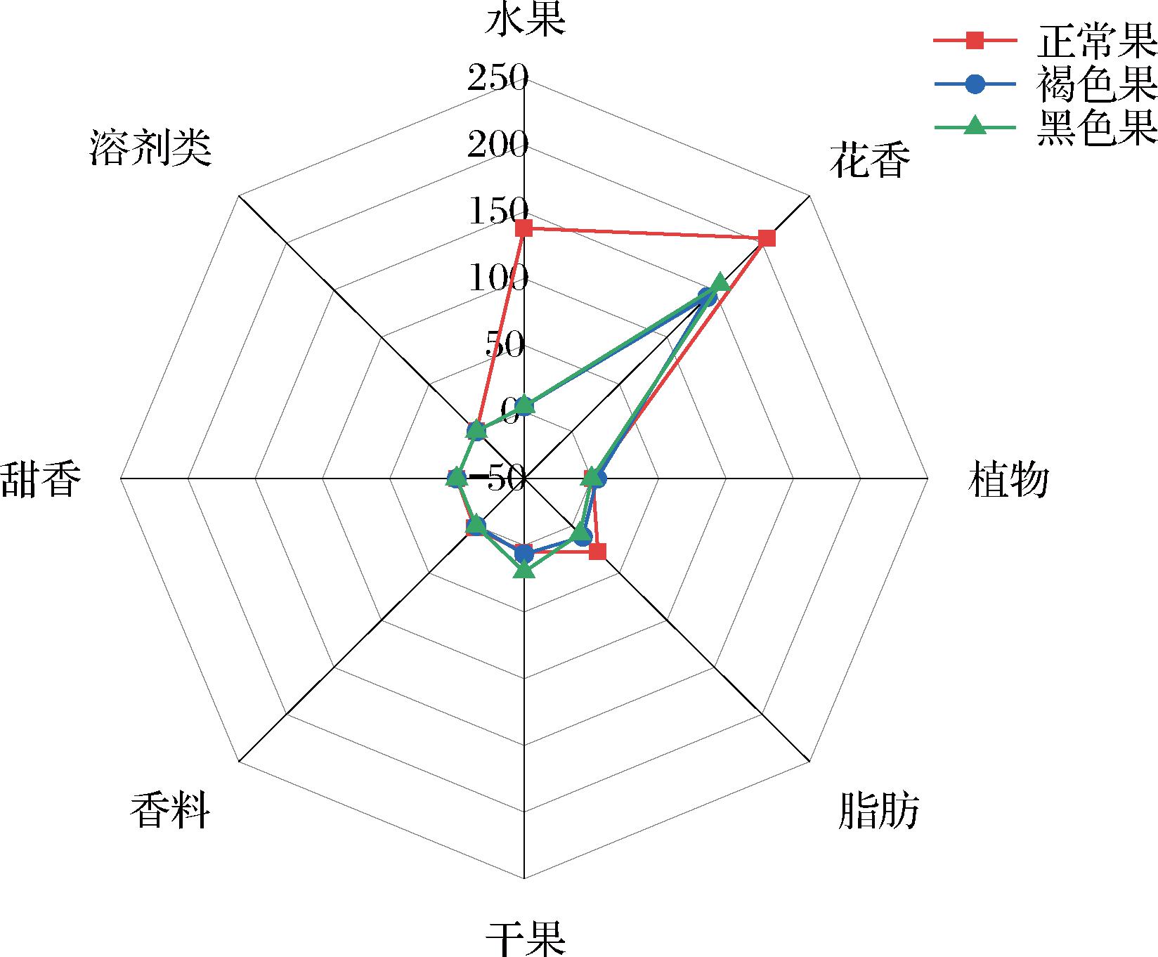 葡萄干化过程中果实生理代谢受到干预,表2给出了不同果实形态下挥发性物质的种类及含量,可以看到,3种形态的威代尔葡萄果实的挥发性物质主要分为醇、醛酮、酯和萜烯四大类。其中正常果果实中的挥发性物质种类为42种,褐色果果实中的挥发性物质种类为41种,黑色果果实中的挥发性物质种类为43种。正常果的挥发性物质含量最高,且显著高于其他2种果实,黑色果的挥发性物质含量最低,其原因可能是果实表皮破裂,挥发性物质的氧化与微生物的代谢降低了挥发性物质的含量[22]。