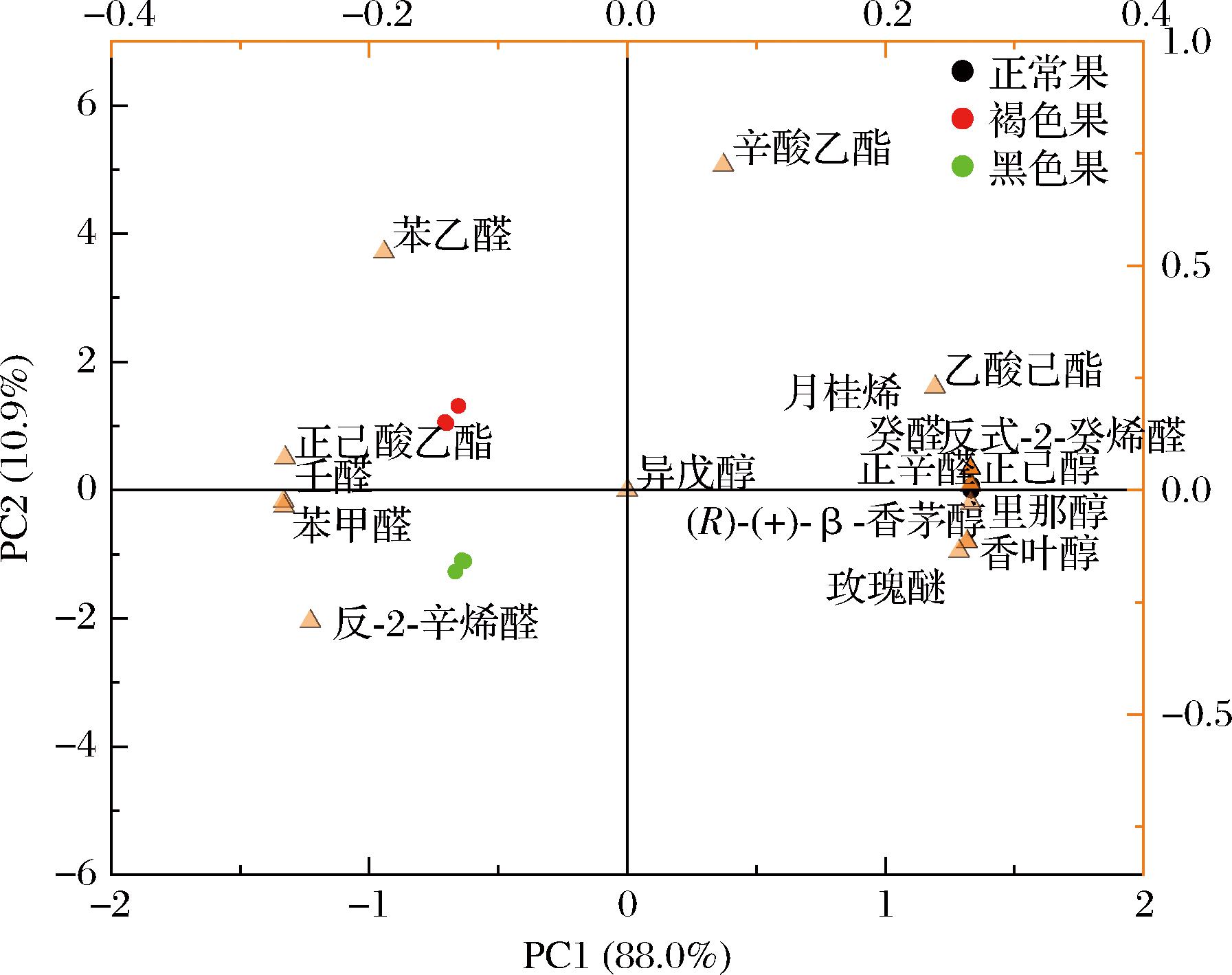 主成分分析(principal components analysis,PCA)是一种常用的数据降维方法,将数据的主要特征进行线性分析并保留在几个不相关的主成分中[26]。PCA中累计贡献率越大,主成分越能更好地反映各个指标的信息。从图3可以看出,PC1的贡献率为88.0%,PC2的贡献率为10.9%,其累计贡献率为98.9%,3种不同形态果实下的挥发性物质差距明显。3种形态下的果实在位置上可以明显区分,正常果位于PC1和PC2的正半轴,褐色果位于PC1的负半轴,PC2的正半轴,黑色果位于PC1和PC2的负半轴。从主成分载荷图可以看出,挥发性化合物乙酸己酯、月桂烯等位于第一主成分的正方向,这些化合物对第一主成分具有正响应,为葡萄果实带来果香、花香和香料香;苯乙醛、正己酸乙酯、辛酸乙酯对第二主成分有正响应,为葡萄果实带来奶油香、果香和花香。
