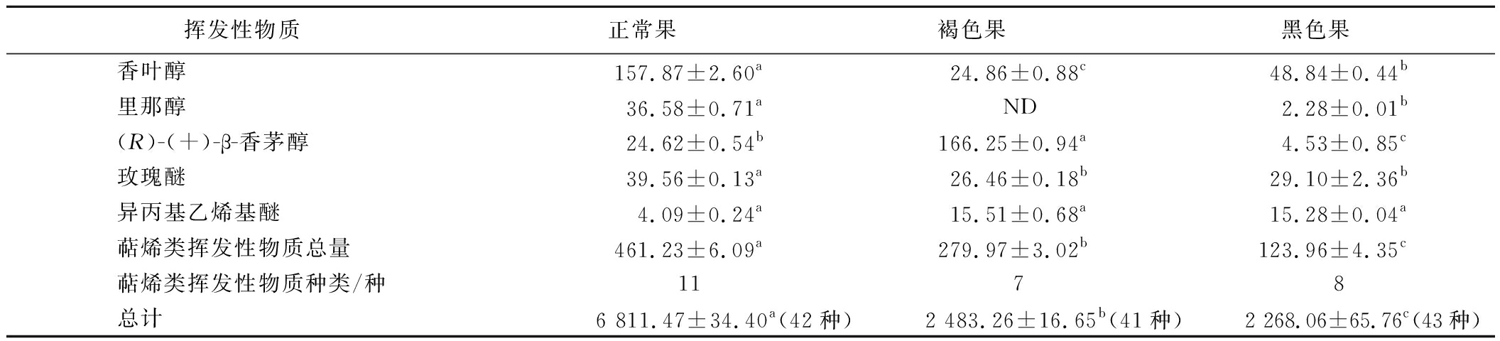 挥发性物质正常果褐色果黑色果香叶醇157.87±2.60a24.86±0.88c48.84±0.44b里那醇36.58±0.71aND2.28±0.01b(R)-(+)-β-香茅醇24.62±0.54b166.25±0.94a4.53±0.85c玫瑰醚39.56±0.13a26.46±0.18b29.10±2.36b异丙基乙烯基醚4.09±0.24a15.51±0.68a15.28±0.04a萜烯类挥发性物质总量461.23±6.09a279.97±3.02b123.96±4.35c萜烯类挥发性物质种类/种1178总计 6 811.47±34.40a(42种) 2 483.26±16.65b(41种) 2 268.06±65.76c(43种)
