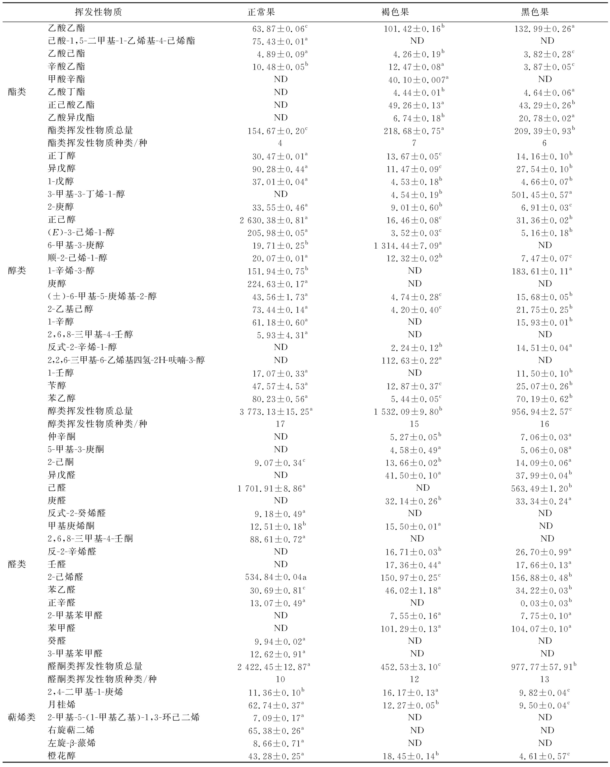 挥发性物质正常果褐色果黑色果乙酸乙酯63.87±0.06c101.42±0.16b132.99±0.26a己酸-1,5-二甲基-1-乙烯基-4-己烯酯75.43±0.01a ND ND乙酸己酯4.89±0.09a4.26±0.19b3.82±0.28c辛酸乙酯10.48±0.05b12.47±0.08a3.87±0.05c甲酸辛酯ND40.10±0.007aND酯类 乙酸丁酯ND4.44±0.01b4.64±0.06a正己酸乙酯ND49.26±0.13a43.29±0.26b乙酸异戊酯ND6.74±0.18b20.78±0.02a酯类挥发性物质总量154.67±0.20c218.68±0.75a209.39±0.93b酯类挥发性物质种类/种476正丁醇30.47±0.01a13.67±0.05c14.16±0.10b异戊醇90.28±0.44a11.47±0.09c27.54±0.10b1-戊醇37.01±0.04a4.53±0.18b4.66±0.07b3-甲基-3-丁烯-1-醇ND4.54±0.19b501.45±0.57a2-庚醇33.55±0.46a9.01±0.60b6.91±0.03c正己醇2 630.38±0.81a16.46±0.08c31.36±0.02b(E)-3-己烯-1-醇205.98±0.05a3.52±0.03c5.16±0.18b6-甲基-3-庚醇19.71±0.25b1 314.44±7.09aND顺-2-己烯-1-醇20.07±0.01a12.32±0.02b7.47±0.07c醇类 1-辛烯-3-醇151.94±0.75bND183.61±0.11a庚醇224.63±0.17aNDND(±)-6-甲基-5-庚烯基-2-醇43.56±1.73a4.74±0.28c15.68±0.05b2-乙基己醇73.44±0.14a4.20±0.40c21.75±0.25b1-辛醇61.18±0.60aND15.93±0.01b2,6,8-三甲基-4-壬醇5.93±4.31aNDND反式-2-辛烯-1-醇ND2.24±0.12b14.51±0.04a2,2,6-三甲基-6-乙烯基四氢-2H-呋喃-3-醇ND112.63±0.22aND1-壬醇17.07±0.33aND11.50±0.10b苄醇47.57±4.53a12.87±0.37c25.07±0.26b苯乙醇80.23±0.56a5.44±0.05c70.19±0.62b醇类挥发性物质总量3 773.13±15.25a1 532.09±9.80b956.94±2.57c醇类挥发性物质种类/种171516仲辛酮ND 5.27±0.05b 7.06±0.03a5-甲基-3-庚酮ND4.58±0.49a5.06±0.08a2-己酮9.07±0.34c13.66±0.02b14.09±0.06a异戊醛ND41.50±0.10a37.99±0.04b己醛1 701.91±8.86a ND563.49±1.20b庚醛ND32.14±0.26b33.34±0.24a反式-2-癸烯醛9.18±0.49aNDND甲基庚烯酮12.51±0.18b15.50±0.01a ND2,6,8-三甲基-4-壬酮88.61±0.72a ND ND反-2-辛烯醛ND16.71±0.03b26.70±0.99a醛类 壬醛ND17.36±0.44a17.66±0.13a2-己烯醛534.84±0.04a150.97±0.25c156.88±0.48b苯乙醛30.69±0.81c46.02±1.18a34.22±0.03b正辛醛13.07±0.49a ND0.03±0.03b2-甲基苯甲醛ND7.55±0.16a7.75±0.10a苯甲醛ND101.29±0.13a104.07±0.10a癸醛9.94±0.02aNDND3-甲基苯甲醛12.62±0.91a ND ND醛酮类挥发性物质总量2 422.45±12.87a452.53±3.10c977.77±57.91b醛酮类挥发性物质种类/种1012132,4-二甲基-1-庚烯11.36±0.10b 16.17±0.13a 9.82±0.04c月桂烯62.74±0.37a12.27±0.05b9.50±0.04c萜烯类2-甲基-5-(1-甲基乙基)-1,3-环己二烯7.09±0.17aNDND右旋萜二烯65.38±0.26a ND ND左旋-β-蒎烯8.66±0.71aNDND橙花醇43.28±0.25a18.45±0.14b4.61±0.57c