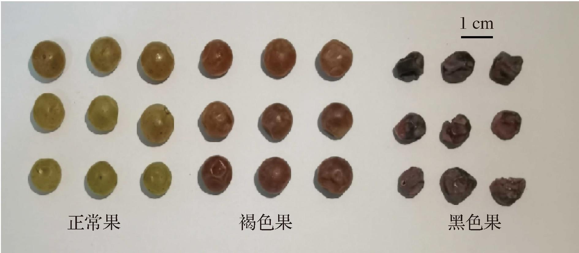 果实形态百粒重/g百粒体积/mL总糖含量/(g/L)可滴定酸含量/(g/L)pH值正常果125.36±2.07a148.07±1.07a287.33±8.08c7.00±0.02b3.93±0.08b褐色果86.30±1.05b92.67±8.31b333.25±11.27b7.19±0.11b4.07±0.01a黑色果45.26±1.83c60.00±7.62c397.74±10.00a11.37±0.17a4.09±0.02a