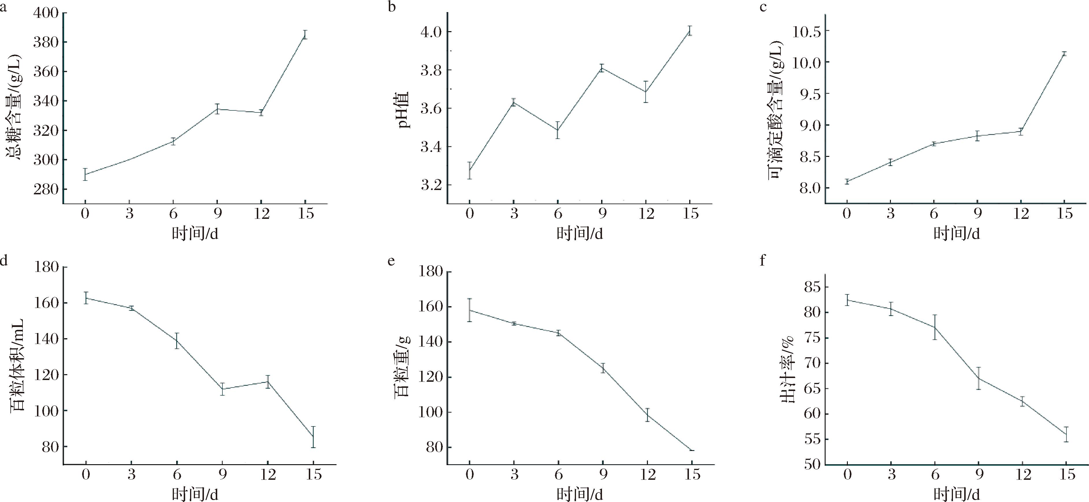 a-总糖;b-pH;c-可滴定酸;d-百粒体积;e-百粒重;f-出汁率