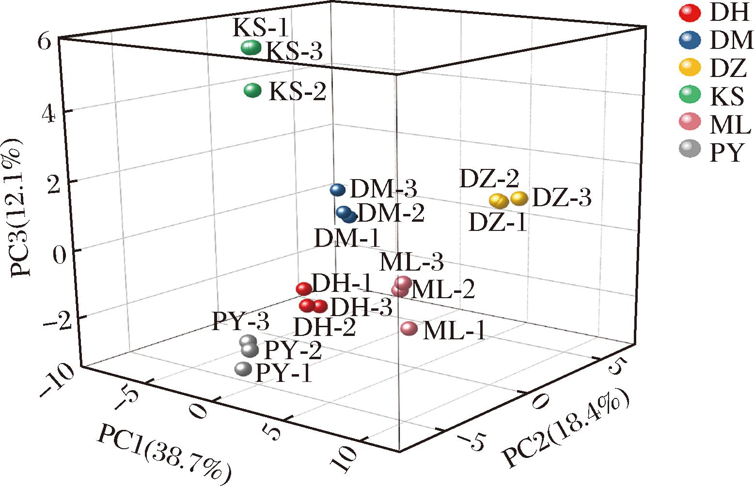以主成分1、2、3为x、y、z轴绘制出不同品种玫瑰鲜花的得分图,如图10所示。KS玫瑰处于主成分3大于0的象限中,而其他5个品种均处于主成分3小于0的象限中,且KS玫瑰对应的位置距离其他5种玫瑰较远,表明KS玫瑰的C14:0、C17:0、C22:2等脂肪酸构成和琥珀酸含量与其他5个玫瑰品种存在较大差异;而DM、PY、DH、ML和DZ 5种玫瑰之间该部分脂肪酸构成相似。另外,云南产地的3种玫瑰相互之间距离也较近,说明该产地的玫瑰在主成分1、2、3上具有相似的营养构成。
