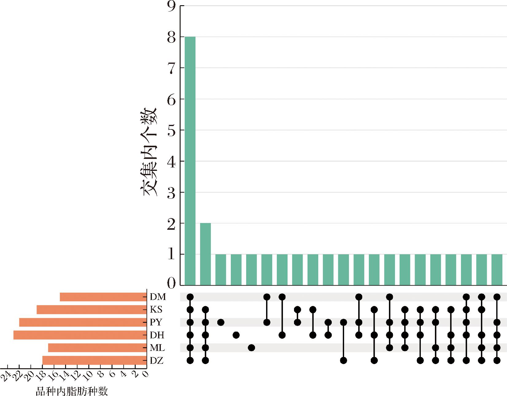 Fig.2 Upset chart of fatty acid composition in different fresh rose flowers