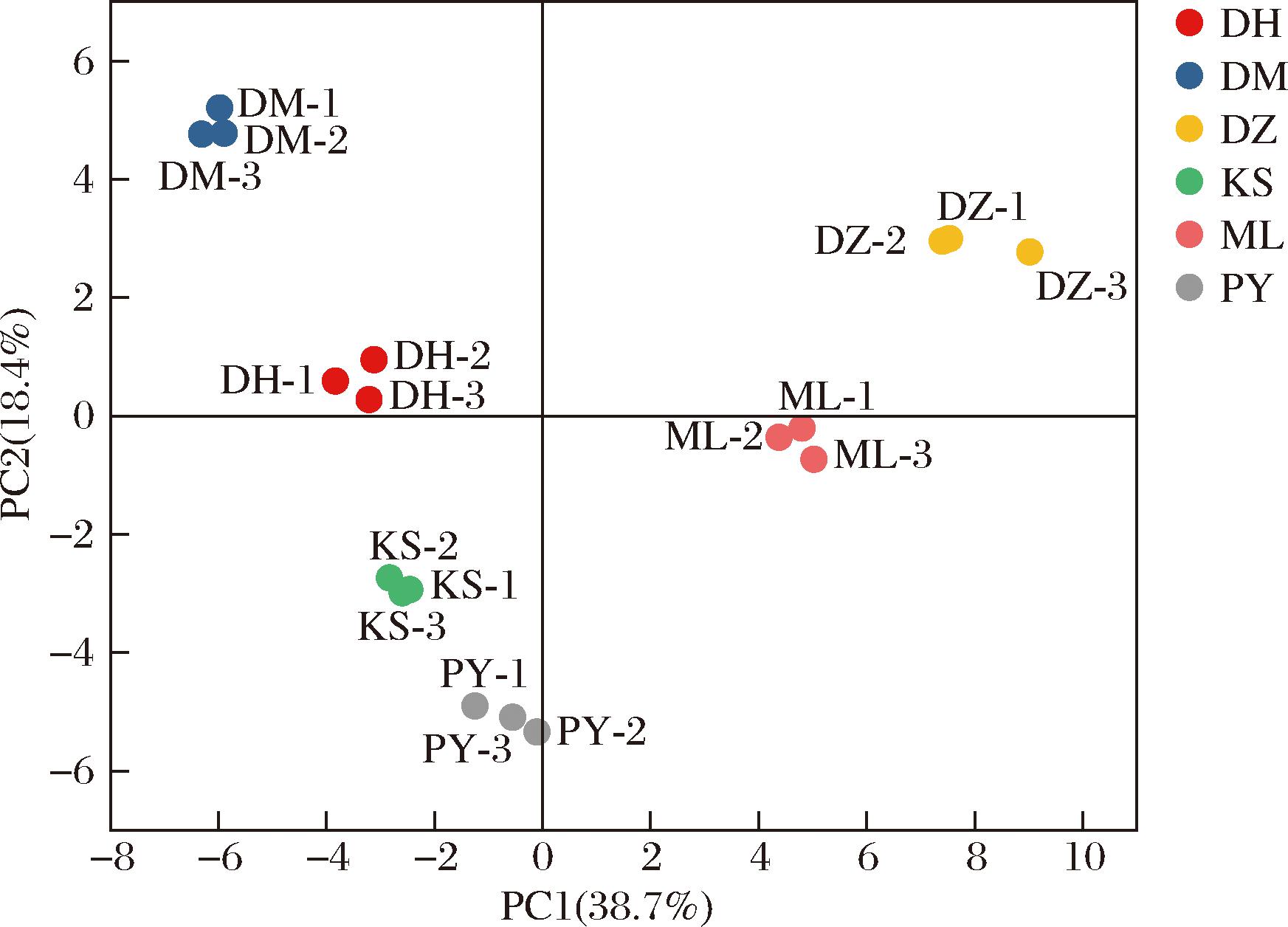 在得分图中,样本的得分决定了样本沿每个主成分轴的位置坐标,可用于检测样本之间的分组、相似性或差异性[24]。以主成分1为x轴、主成分2为y轴绘制出不同品种玫瑰鲜花的得分图,如图9所示。DM玫瑰与DH玫瑰、KS玫瑰与PY玫瑰分别处于同一象限内且相距较近,ML玫瑰和DZ玫瑰的距离也较短,说明以上3组玫瑰的L-赖氨酸、精氨酸、L-组氨酸、L-天冬酰胺等氨基酸构成、C18:1、C18:0、C20:1等脂肪酸构成、以及奎尼酸、木糖和甘露糖含量差异较小。同时,DM玫瑰与PY玫瑰在主成分1上距离较远,说明它们之间氨基酸构成存在较大差异。同理,DM玫瑰与DZ玫瑰在C18:1、C18:0、C20:1、奎尼酸等营养物质的构成上差异最大。