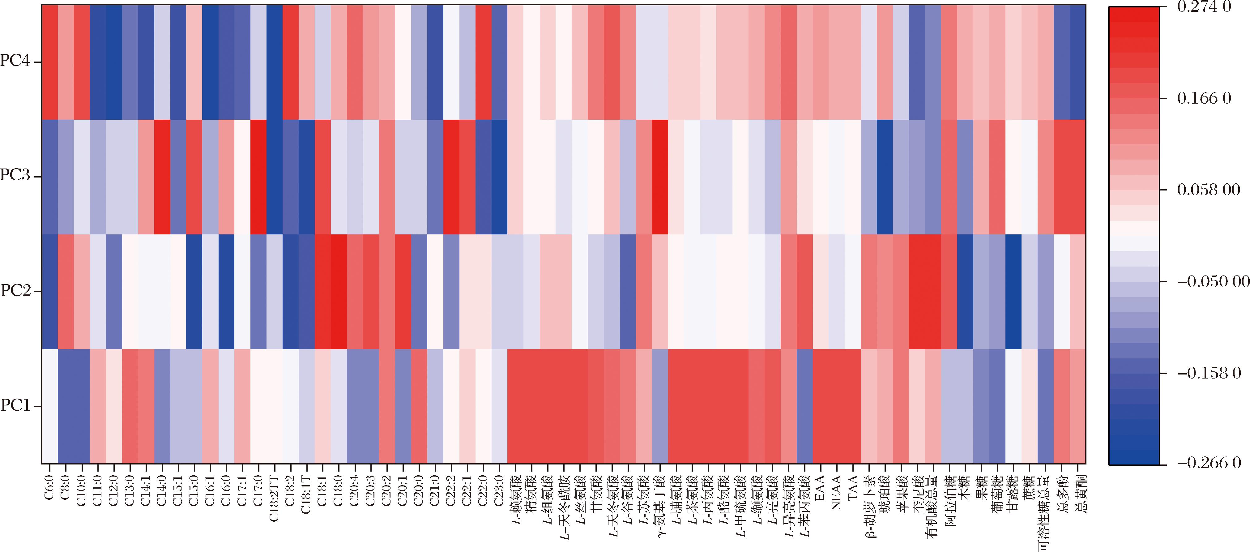 载荷代表了变量与主成分之间的相关性[24],可用于了解每个变量对数据中有意义的变化有多大的贡献,并解释变量之间的关系[25]。根据载荷将65个营养及活性成分指标对于前4个主成分的载荷绘制成热力图(图8),如图8所示,L-赖氨酸、精氨酸、L-组氨酸、L-天冬酰胺、L-丝氨酸、L-脯氨酸、L-茶氨酸、L-丙氨酸、L-酪氨酸、L-甲硫氨酸的含量与主成分1呈较强的正相关;C18:1、C18:0、C20:1、奎尼酸的含量与主成分2呈较强正相关,C15:0、C16:0、C18:2、木糖、甘露糖含量则呈较强的负相关;C14:0、C17:0、C22:2的含量与主成分3呈较强正相关,C18:2TT、C18:1T、C18:0、琥珀酸的含量则呈较强的负相关;C6:0、C18:2、C22:0的含量与主成分4呈较强正相关,C12:0、C16:1、C18:2TT、总黄酮含量则呈较强的负相关。综上,可以认为主成分1主要代表了氨基酸相关变量的信息,而脂肪酸、有机酸及可溶性糖等变量的信息则分散于主成分2、3、4中。