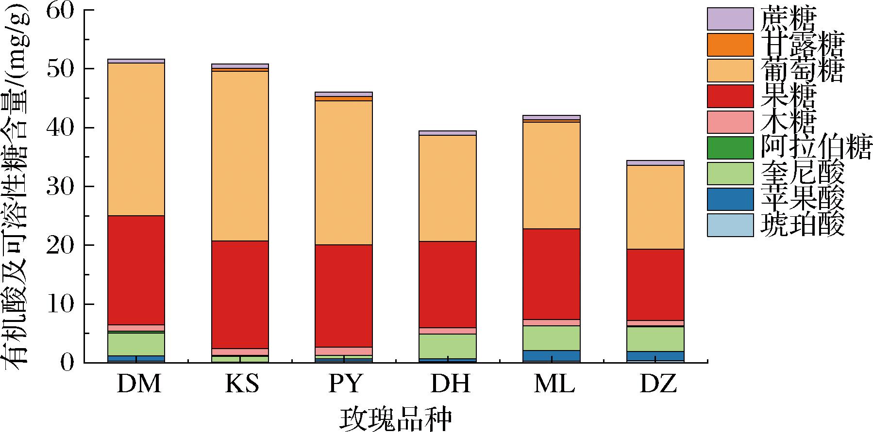 6种玫瑰样品经过GC检测后通过混合标准品的出峰时间进行定性,奎尼酸标准曲线进行定量,得到的结果如图5所示。6个样品中共检测到3种有机酸和6种可溶性糖:琥珀酸的含量为0.22~0.35 mg/g,KS玫瑰未检出;苹果酸含量为0.15~1.82 mg/g;奎尼酸含量为0.56~4.20 mg/g;木糖含量为0.88~1.42 mg/g;果糖含量为12.17~18.53 mg/g;葡萄糖的含量为14.27~28.87 mg/g;甘露糖的含量为0.40~0.72 mg/g,DM、DH和DZ玫瑰均未检出;蔗糖含量为0.71~0.81 mg/g。6种玫瑰含有的可溶性糖均以葡萄糖和果糖为主,有机酸则以奎尼酸为主。6种玫瑰中,葡萄糖含量较高的品种,其果糖和奎尼酸含量也较高,滋味更加浓郁;仅PY和KS玫瑰奎尼酸含量较低,高甜度低酸度的食物适口性更高。