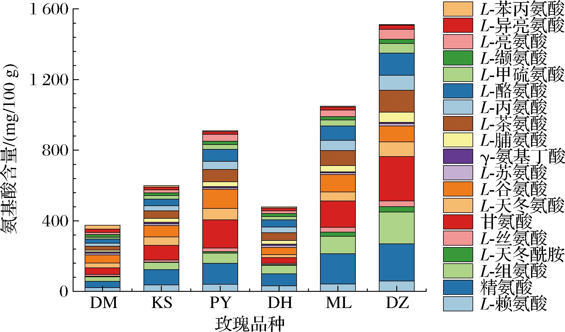 6个品种玫瑰鲜花经过LC检测后均测得19种氨基酸,根据氨基酸标品的峰面积比进行定量,整理得到图3。每种玫瑰的总氨基酸含量由高到低排列为DZ、ML、PY、KS、DH和DM,总氨基酸含量为374.49~1 512.19 mg/100 g。DZ玫瑰的氨基酸构成以甘氨酸、精氨酸、L-组氨酸、L-酪氨酸和L-茶氨酸为主,部分氨基酸含量之间存在较大差别。ML、PY和KS玫瑰含量较高的氨基酸为精氨酸、甘氨酸和谷氨酸。DH和DM玫瑰的氨基酸构成较为均匀,不同氨基酸种类之间含量差异较小。氨基酸不仅是重要的营养成分,也是植物体内香气合成的前体物质,因此,玫瑰鲜花氨基酸构成的差异可能通过其挥发性成分反映[13]。