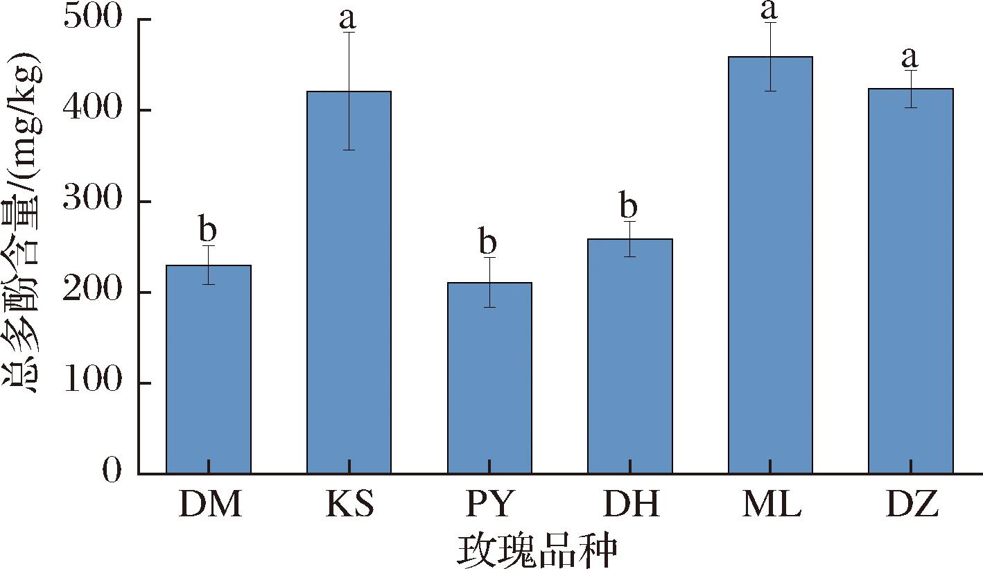 多酚广泛存在于植物中,是一类具有抗衰老、抗心血管疾病作用的小分子次级代谢产物[21]。如图7所示,6个品种玫瑰总多酚含量为210.69~458.70 mg/kg,含量由高到低依次为ML玫瑰(458.70 mg/kg)、DZ玫瑰(423.72 mg/kg)、KS玫瑰(420.87 mg/kg)、DH玫瑰(258.55 mg/kg)、DM玫瑰(229.91 mg/kg)与PY玫瑰(210.69 mg/kg)。云南产地的玫瑰总多酚平均含量为380.32 mg/kg,比产于甘肃的玫瑰总多酚平均含量高了接近100 mg/kg。玫瑰鲜花中多酚的累积一方面与产地气候相关,另一方面也受种质遗传因素的影响[22],所以KS玫瑰的总多酚含量能显著高于同产地的另外2个品种。