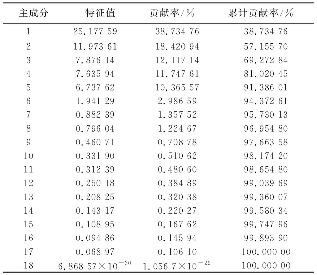 主成分特征值贡献率/%累计贡献率/%125.177 5938.734 7638.734 76211.973 6118.420 9457.155 7037.876 1412.117 1469.272 8447.635 9411.747 6181.020 4556.737 6210.365 5791.386 0161.941 292.986 5994.372 6170.882 391.357 5295.730 1380.796 041.224 6796.954 8090.460 710.708 7897.663 58100.331 900.510 6298.174 20110.312 390.480 6098.654 80120.250 180.384 8999.039 69130.208 250.320 3899.360 07140.143 170.220 2799.580 34150.108 950.167 6299.747 96160.094 860.145 9499.893 90170.068 970.106 10100.000 00186.868 57×10-301.056 7×10-29100.000 00