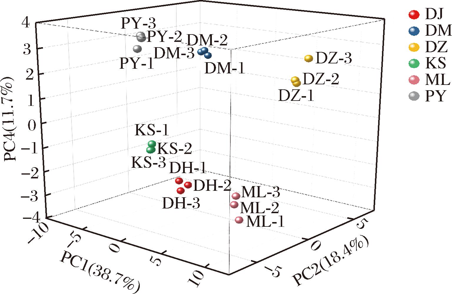 以主成分1、2、4为x、y、z轴绘制出不同品种玫瑰鲜花的得分图,如图11所示。DM、PY、DZ玫瑰处于主成分4大于0的象限中,其他3种玫瑰均处于主成分4小于0的象限,且这3种玫瑰所处位置与另外3种均存在较大的距离,表明DM、PY、DZ玫瑰在主成分4上具有相似的营养构成,即其C6:0、C18:2、C22:0等脂肪酸构成和总黄酮含量相似,而与KS、DH、ML玫瑰存在较大差异。