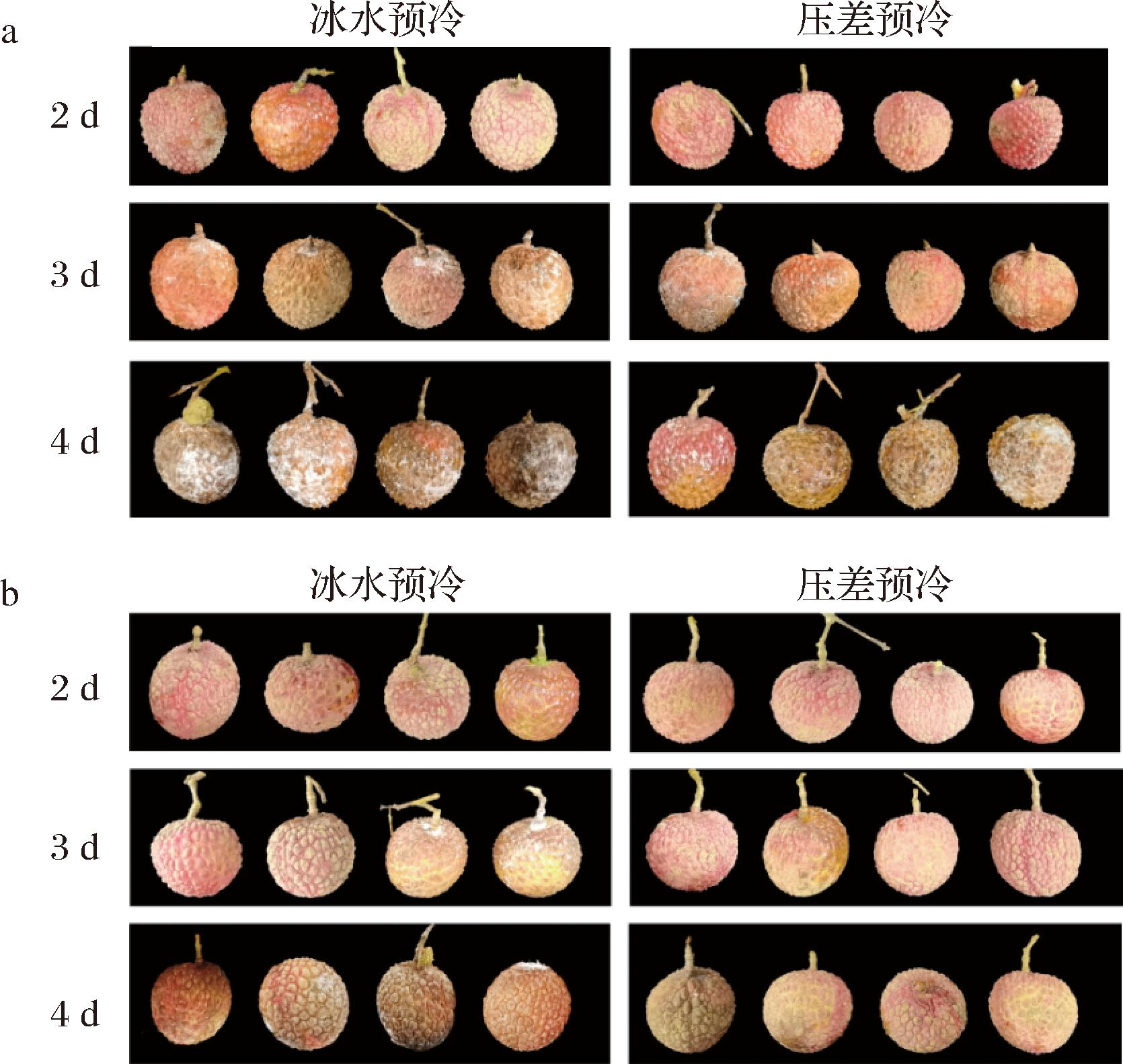 初始果心温度约为26 ℃。冰水预冷:将荔枝置于温度4 ℃左右的冰水中,预冷时间20 min,预冷后果心温度约为7 ℃。压差预冷:将荔枝置于压差预冷柜中,柜内温度4 ℃左右,预冷时间45 min,预冷后果心温度约为7 ℃。