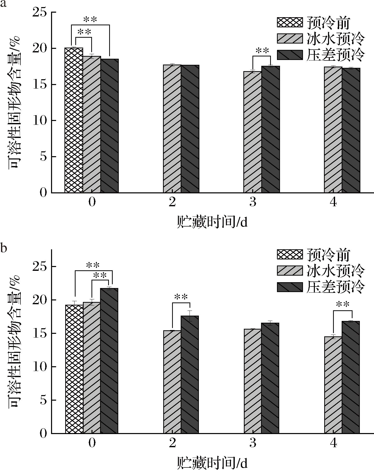 果实贮藏过程中,可溶性固形物及可滴定酸可以反映果实内在品质的变化。可溶性固形物作为参与果实采后代谢活动的底物,在贮藏过程中会随着果实不断消耗而减少[41]。如图8所示,2个荔枝品种果肉的可溶性固形物含量在整个贮运期间呈现下降趋势,经压差预冷处理的荔枝可溶性固形物含量在部分贮运期极显著(P<0.01)高于冰水预冷,其余时期无显著性差异。在贮运0 d时,预冷后‘玉荷包’的可溶性固形物含量高于预冷前(图8-b),这可能是由于预冷及时抑制了果实的呼吸作用,减少糖分的消耗,从而导致可溶性固形物含量略微增加,这一类似结果也可在红提葡萄[19]的预冷试验中观测到;而‘桂味’则与之相反(图8-a),这种差异变化可能是由于低温处理对细胞造成损害,造成部分内容物外溢或流失,结合2.5节中MDA结果可知预冷处理对‘桂味’细胞膜造成了损伤,而对玉荷包无显著影响,在路恒[42]的研究中也表明低温贮藏下香蕉细胞膜受损严重,可溶性固形物含量低于其他处理组。在贮运4 d时,冰水预冷和压差预冷的‘桂味’荔枝果肉可溶性固形物含量分别为17.43%和16.87%,相较于0 d分别下降了7.8%和6.1%;‘玉荷包’荔枝冰水预冷和压差预冷的可溶性固形物含量分别为14.50%和16.80%,相较于0 d分别下降了26.2%和22.0%。由此可以看出,相较于冰水预冷处理,压差预冷处理可减缓荔枝贮运过程中可溶性固形物的下降幅度,维持荔枝品质。