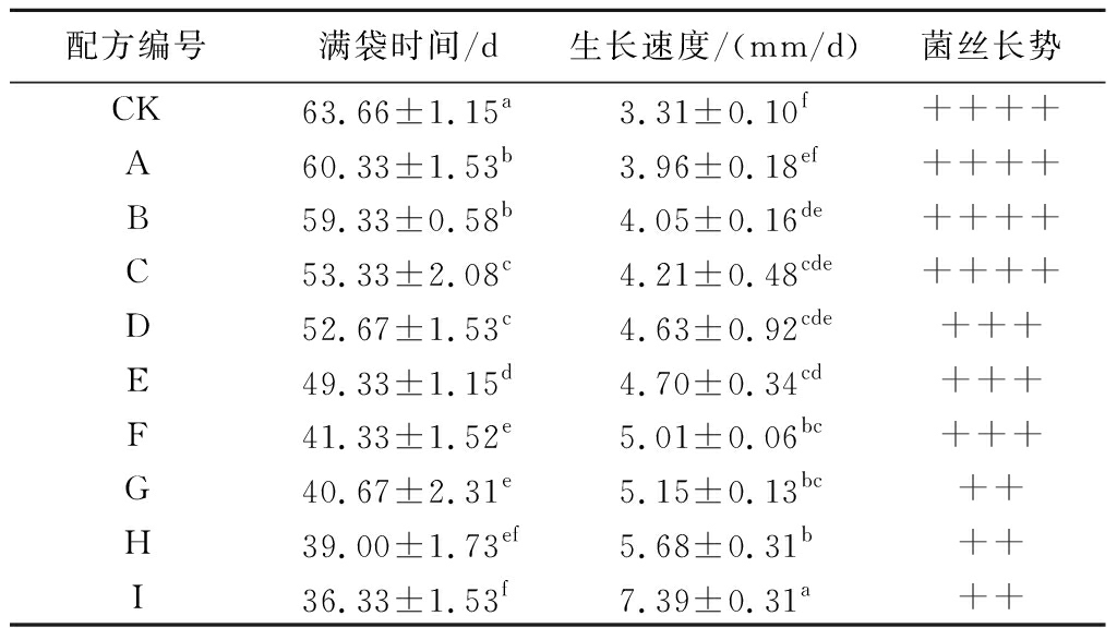 配方编号满袋时间/d生长速度/(mm/d)菌丝长势CK63.66±1.15a3.31±0.10f++++A60.33±1.53b3.96±0.18ef++++B59.33±0.58b4.05±0.16de++++C53.33±2.08c4.21±0.48cde++++D52.67±1.53c4.63±0.92cde+++E49.33±1.15d4.70±0.34cd+++F41.33±1.52e5.01±0.06bc+++G40.67±2.31e5.15±0.13bc++H39.00±1.73ef5.68±0.31b++I36.33±1.53f7.39±0.31a++