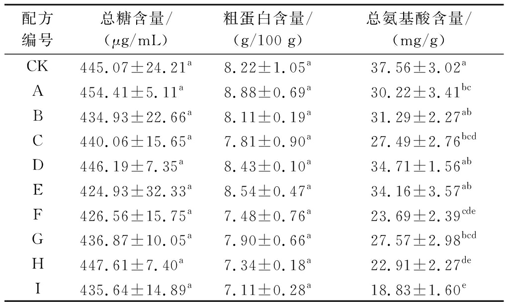 配方编号总糖含量/(μg/mL)粗蛋白含量/(g/100 g)总氨基酸含量/(mg/g)CK445.07±24.21a8.22±1.05a37.56±3.02aA454.41±5.11a8.88±0.69a30.22±3.41bcB434.93±22.66a8.11±0.19a31.29±2.27abC440.06±15.65a7.81±0.90a27.49±2.76bcdD446.19±7.35a8.43±0.10a34.71±1.56abE424.93±32.33a8.54±0.47a34.16±3.57abF426.56±15.75a7.48±0.76a23.69±2.39cdeG436.87±10.05a7.90±0.66a27.57±2.98bcdH447.61±7.40a7.34±0.18a22.91±2.27deI435.64±14.89a7.11±0.28a18.83±1.60e
