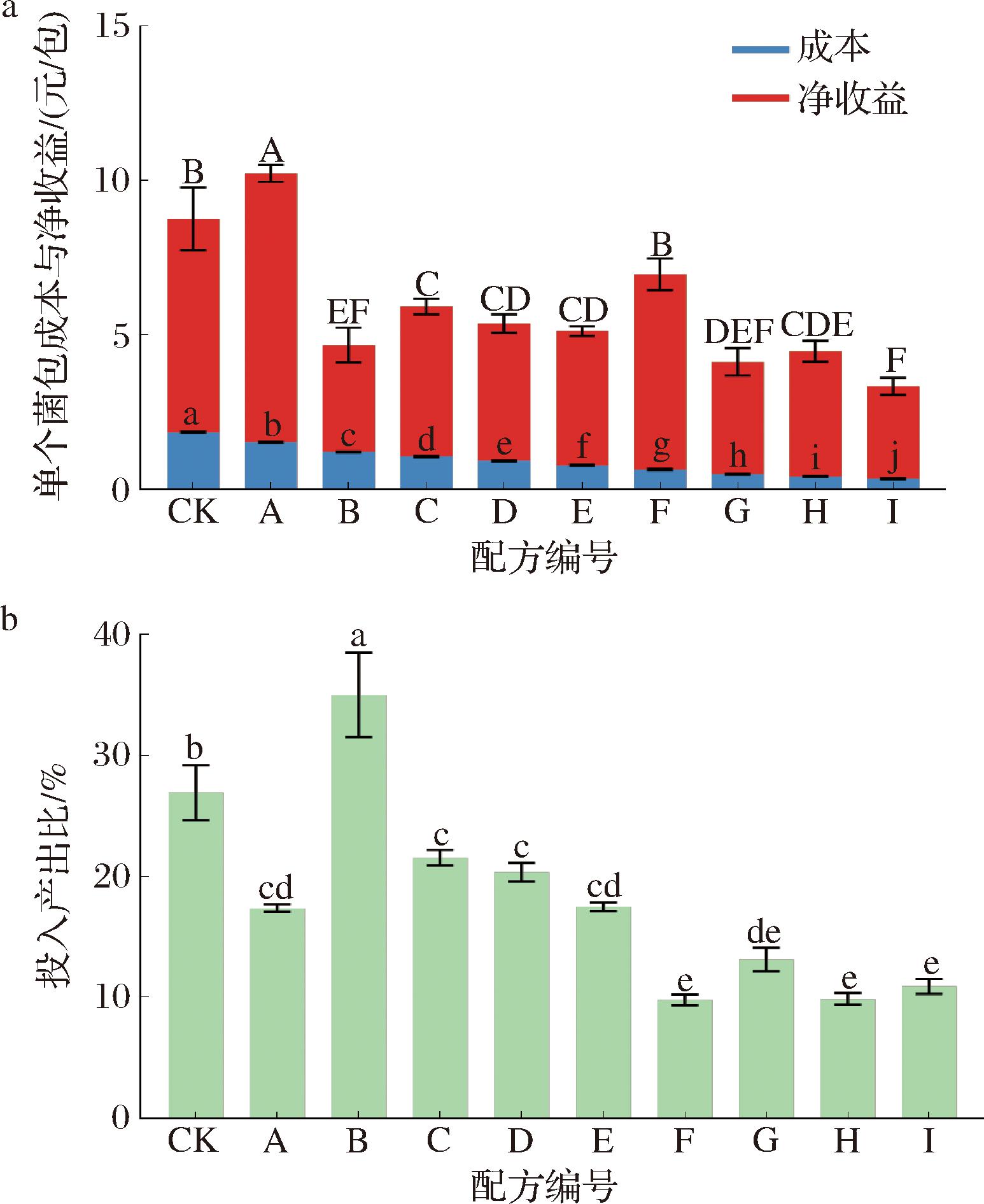 a-不同配方单个菌包成本与净;b-不同配方菌包投入产出比