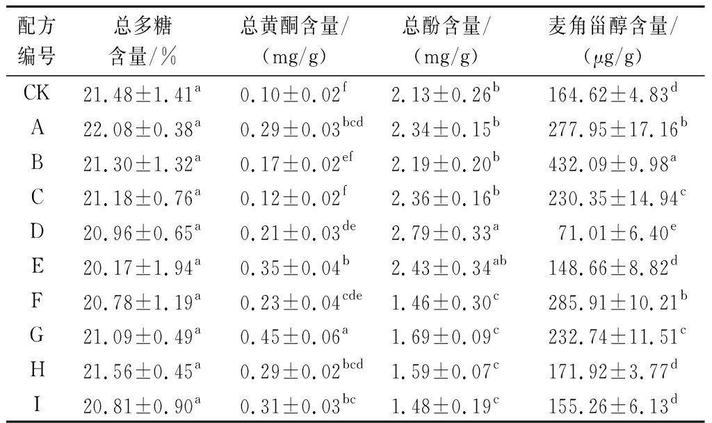 配方编号总多糖含量/%总黄酮含量/(mg/g)总酚含量/(mg/g)麦角甾醇含量/(μg/g)CK21.48±1.41a0.10±0.02f2.13±0.26b164.62±4.83dA22.08±0.38a0.29±0.03bcd2.34±0.15b277.95±17.16bB21.30±1.32a0.17±0.02ef2.19±0.20b432.09±9.98aC21.18±0.76a0.12±0.02f2.36±0.16b230.35±14.94cD20.96±0.65a0.21±0.03de2.79±0.33a71.01±6.40eE20.17±1.94a0.35±0.04b2.43±0.34ab148.66±8.82dF20.78±1.19a0.23±0.04cde1.46±0.30c285.91±10.21bG21.09±0.49a0.45±0.06a1.69±0.09c232.74±11.51cH21.56±0.45a0.29±0.02bcd1.59±0.07c171.92±3.77dI20.81±0.90a0.31±0.03bc1.48±0.19c155.26±6.13d