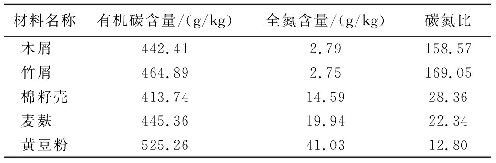 材料名称有机碳含量/(g/kg)全氮含量/(g/kg)碳氮比木屑 442.412.79158.57竹屑 464.892.75169.05棉籽壳413.7414.5928.36麦麸 445.3619.9422.34黄豆粉525.2641.0312.80