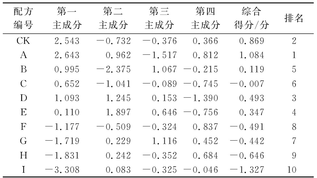 表8 不同配方玉木耳主成分及综合得分