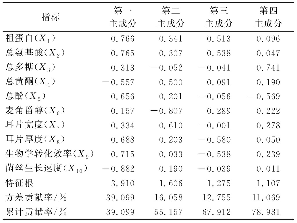 指标第一主成分第二主成分第三主成分第四主成分粗蛋白(X1)0.7660.3410.5130.096总氨基酸(X2)0.7650.3070.5380.047总多糖(X3)0.313-0.052-0.0410.741总黄酮(X4)-0.5570.5000.0910.190总酚(X5)0.6560.201-0.056-0.569麦角甾醇(X6)0.157-0.8070.2890.222耳片宽度(X7)-0.3340.610-0.0010.278耳片厚度(X8)0.6880.203-0.5800.050生物学转化效率(X9)0.7150.033-0.5380.239菌丝生长速度(X10)-0.8820.190-0.0390.011特征根3.9101.6061.2751.107方差贡献率/%39.09916.05812.75511.069累计贡献率/%39.09955.15767.91278.981