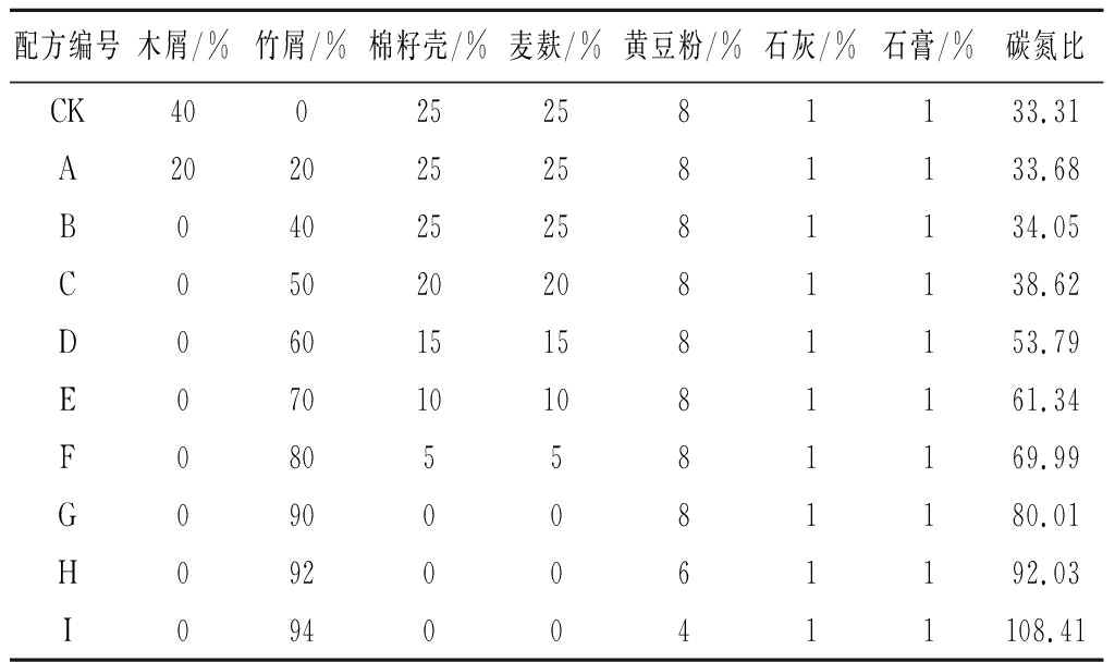 配方编号木屑/%竹屑/%棉籽壳/%麦麸/%黄豆粉/%石灰/%石膏/%碳氮比CK400252581133.31A2020252581133.68B040252581134.05C050202081138.62D060151581153.79E070101081161.34F0805581169.99G0900081180.01H0920061192.03I09400411108.41
