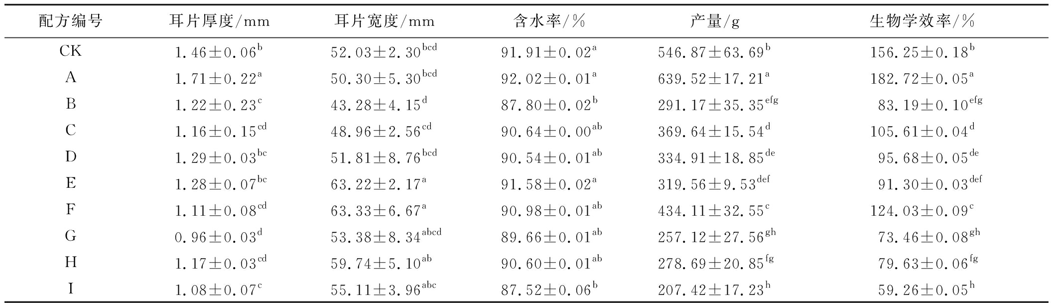 配方编号耳片厚度/mm耳片宽度/mm含水率/%产量/g生物学效率/%CK1.46±0.06b52.03±2.30bcd91.91±0.02a546.87±63.69b156.25±0.18bA1.71±0.22a50.30±5.30bcd92.02±0.01a639.52±17.21a182.72±0.05aB1.22±0.23c43.28±4.15d87.80±0.02b291.17±35.35efg83.19±0.10efgC1.16±0.15cd48.96±2.56cd90.64±0.00ab369.64±15.54d105.61±0.04dD1.29±0.03bc51.81±8.76bcd90.54±0.01ab334.91±18.85de95.68±0.05deE1.28±0.07bc63.22±2.17a91.58±0.02a319.56±9.53def91.30±0.03defF1.11±0.08cd63.33±6.67a90.98±0.01ab434.11±32.55c124.03±0.09cG0.96±0.03d53.38±8.34abcd89.66±0.01ab257.12±27.56gh73.46±0.08ghH1.17±0.03cd59.74±5.10ab90.60±0.01ab278.69±20.85fg79.63±0.06fgI1.08±0.07c55.11±3.96abc87.52±0.06b207.42±17.23h59.26±0.05h