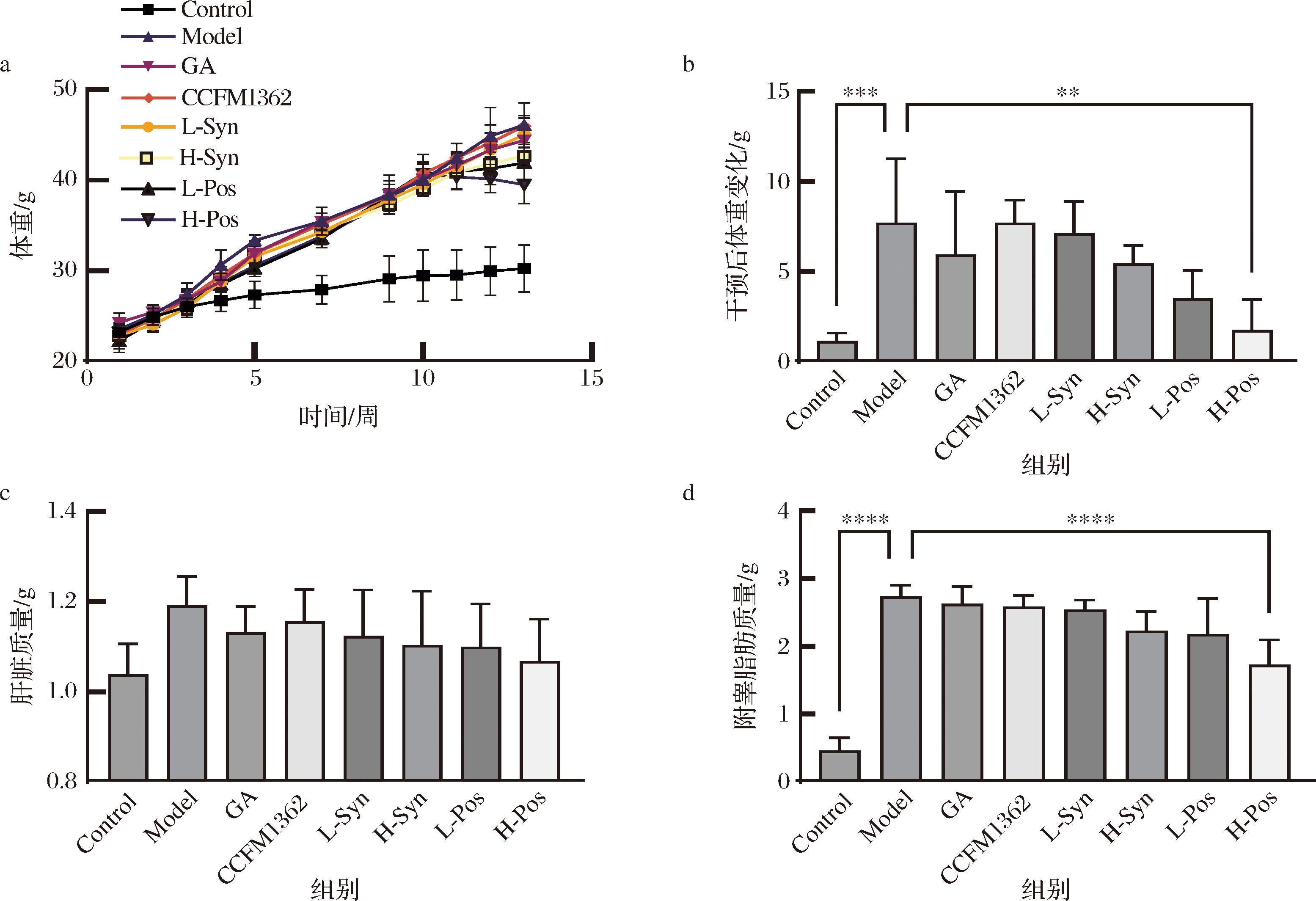 a-实验周期小鼠体重变化;b-干预后小鼠体重变化;c-小鼠肝脏重量;d-小鼠附睾脂肪重量