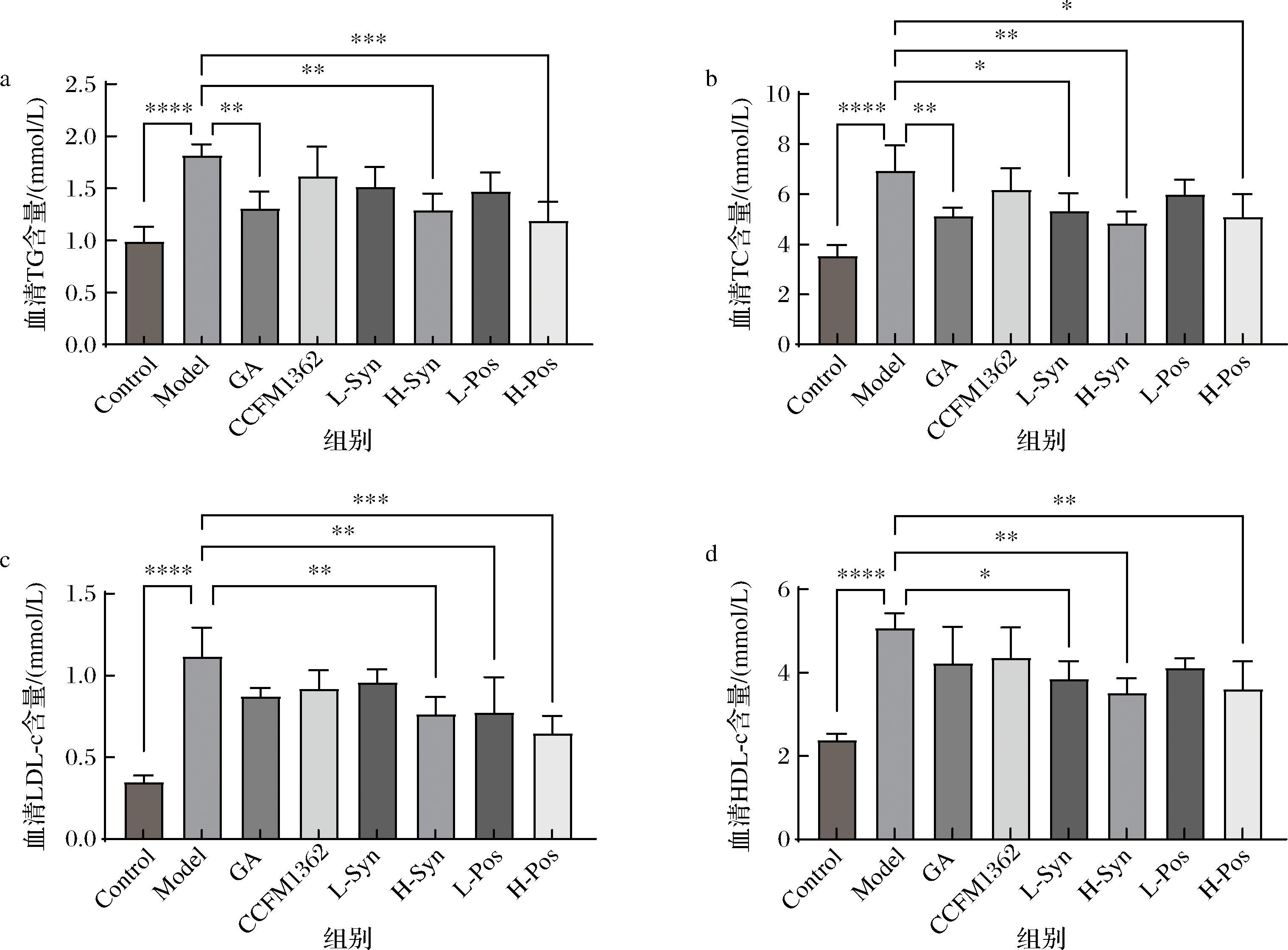 如图3-a~图3-d所示,模型组小鼠的血清TG、TC、LDL-c和HDL-c含量较对照组均呈现显著升高(P<0.000 1),表明高脂饮食导致了高血脂。