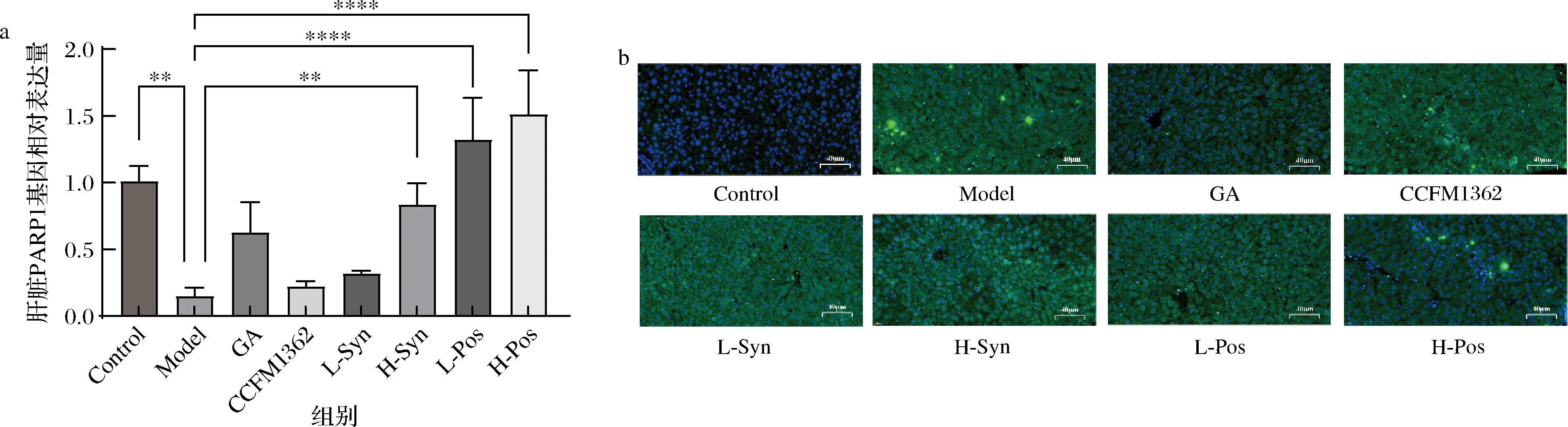 如图7-a显示,与对照组相比,高脂饮食模型组小鼠的PARP1表达显著下降(P<0.01),与模型组相比,单独灌胃GA和卷曲乳杆菌CCFM1362的小鼠PARP1相对表达量分别提升了321.08%和48.21%,但无统计学显著性。合生制剂干预后,低剂量与高剂量提升PARP1表达量113%和460.54%(P<0.01),但其效果仍显著低于发酵液组的效果,发酵液低剂量和高剂量组的PARP1表达分别上调789.24%(P<0.000 1)和916.14%(P<0.000 1),表明卷曲乳杆菌CCFM1362发酵GA能够有效增强DNA修复相关基因的表达,减轻DNA损伤。