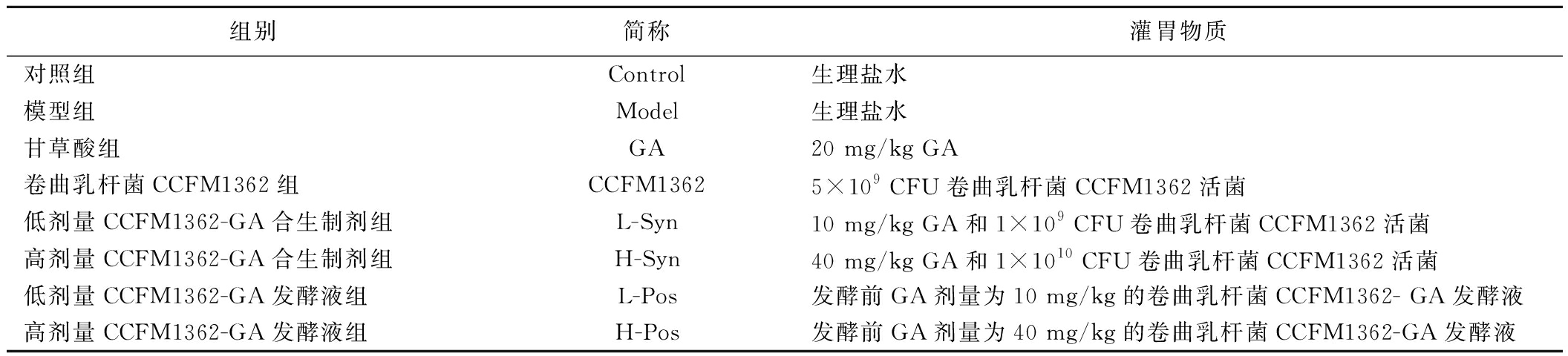 组别简称灌胃物质对照组Control生理盐水模型组Model生理盐水甘草酸组GA20 mg/kg GA卷曲乳杆菌CCFM1362组CCFM13625×109 CFU卷曲乳杆菌CCFM1362活菌低剂量CCFM1362-GA合生制剂组L-Syn10 mg/kg GA和1×109 CFU卷曲乳杆菌CCFM1362活菌高剂量CCFM1362-GA合生制剂组H-Syn40 mg/kg GA和1×1010 CFU卷曲乳杆菌CCFM1362活菌低剂量CCFM1362-GA发酵液组L-Pos发酵前GA剂量为10 mg/kg的卷曲乳杆菌CCFM1362- GA发酵液高剂量CCFM1362-GA发酵液组H-Pos发酵前GA剂量为40 mg/kg的卷曲乳杆菌CCFM1362-GA发酵液