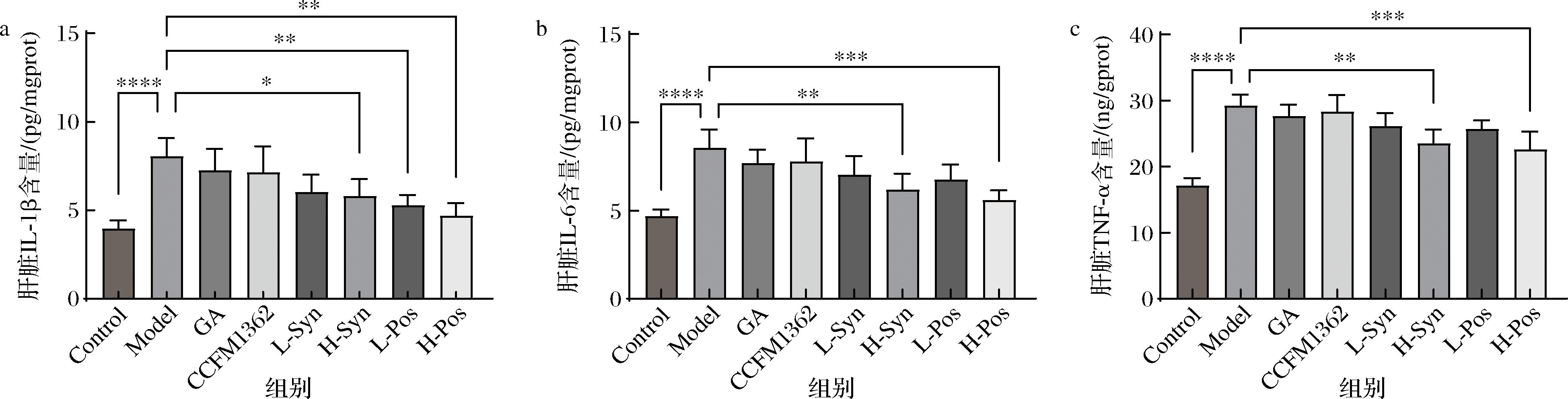 a-肝脏IL-1β含量;b-肝脏IL-6含量;c-肝脏TNF-α含量